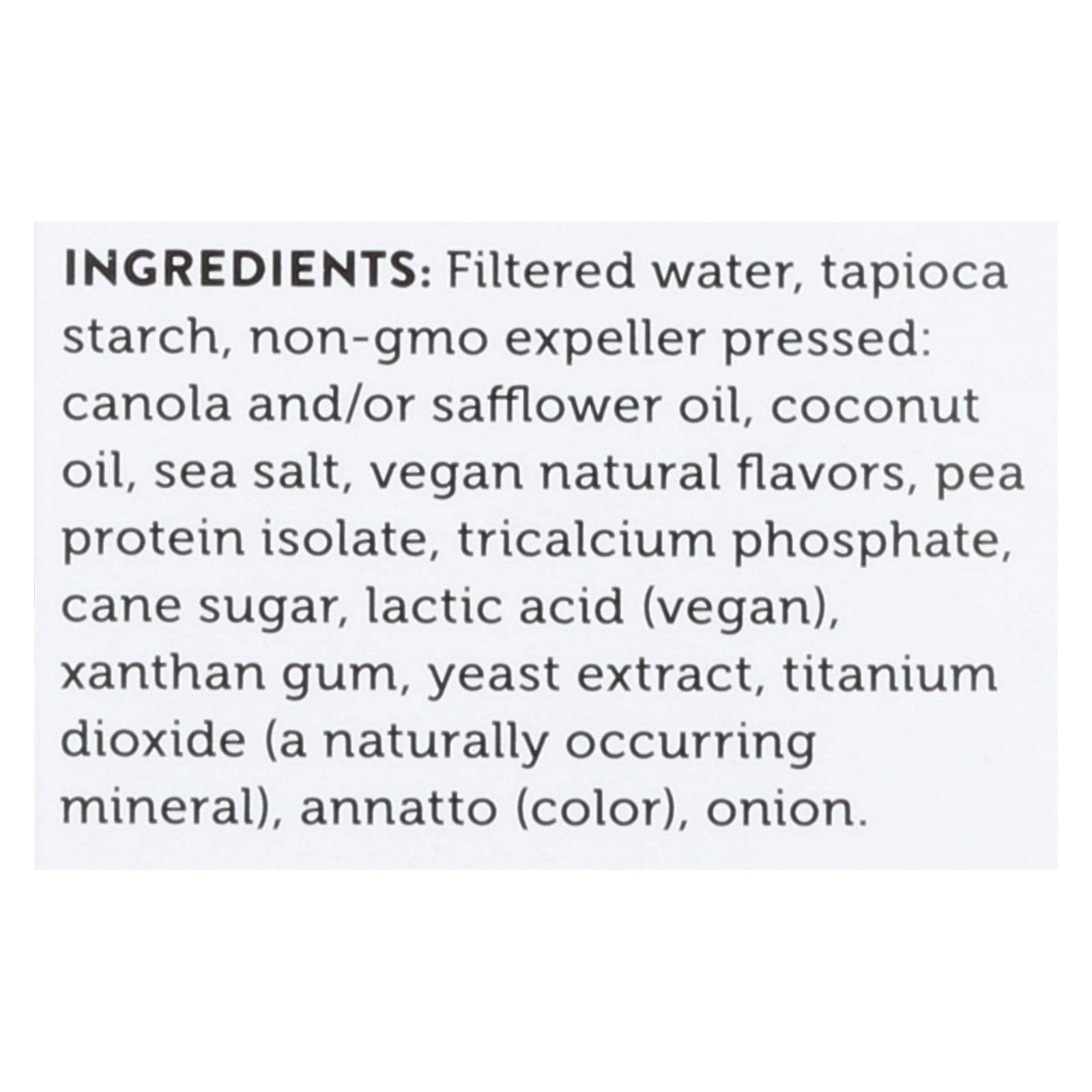 ingredients : filtered water;tapioca starch;expeller pressed: canola and/or safflower oil;coconut oil;salt;pea protein;vegan natural flavors;tricalcium phosphate;cane sugar;lactic acid;vegan;xanthan gum;yeast extract;titanium dioxide color;naturally occurring mineral;annatto color;onion