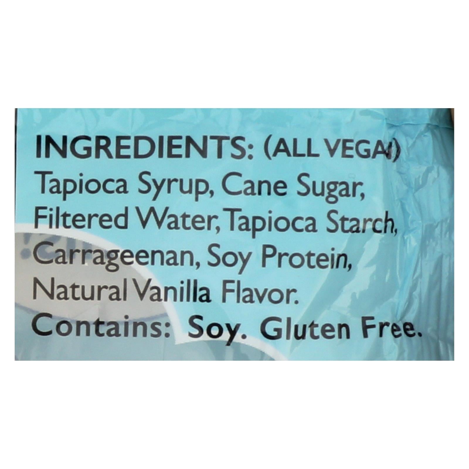 ingredients : all vegan;tapioca syrup;cane sugar;filtered water;tapioca starch;carrageenan;soy protein;natural vanilla flavor