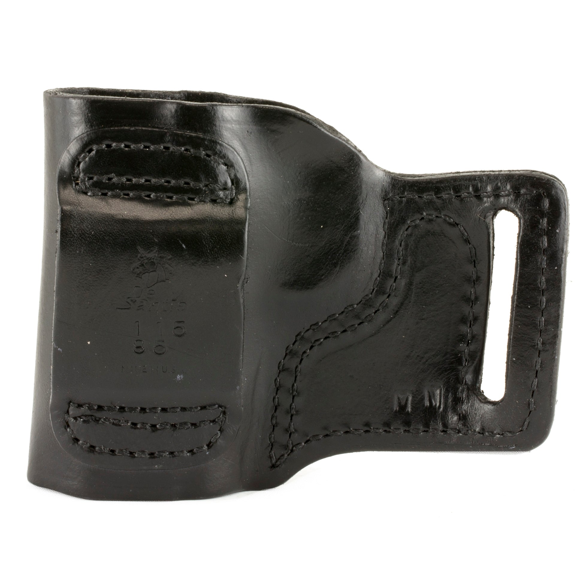 Their new E-Gat Slide is a basic neutral cant concealment OWB holster that works equally well on the strong side or cross draw. The E-Gat Slide works with both revolvers and autos and is offered only in BLACK-finished top grain leather. It is available for most medium & large autos and most small frame revolvers.
