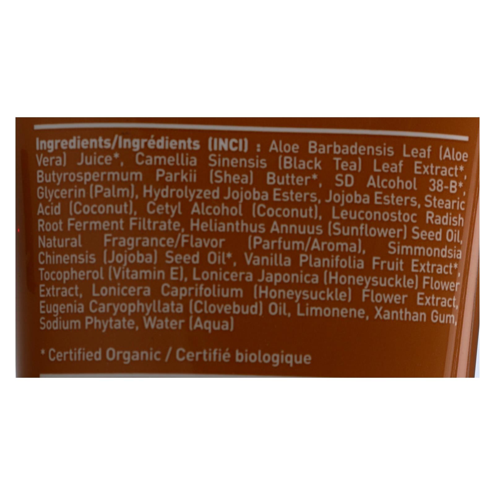 ingredients : aloe barbadensis leaf;aloe vera;juice;camellia sinensis;black tea;leaf extract;butyrospermum parkii;shea;butter;sd alcohol 38-b;glycerin;palm;hydrolyzed jojoba esters;jojoba esters;stearic acid;coconut;cetyl alcohol;leuconostoc radish root ferment filtrate;helianthus annuus;sunflower;seed oil;natural fragrance/flavor;parfum/aroma;simmondsia chinensis;jojoba;vanilla planifolia fruit extract;tocopherol;vitamin e;lonicera japonica;honeysuckle;flower extract;lonicera caprifolium;eugenia caryophyllat