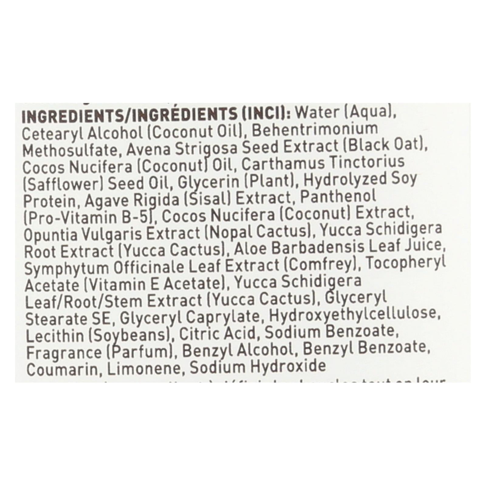 ingredients : water;aqua;cetearyl alcohol;coconut;oil;behentrimonium methosulfate;avena strigosa seed extract;black oat;cocos nucifera;carthamus tinctorius;safflower;seed oil;glycerin;plant;hydrolyzed soy protein;agave rigida;sisal;extract;panthenol;pro-vitamin b-5;opuntia vulgaris extract;nopal cactus;yucca schidigera root extract;yucca cactus;aloe barbadensis leaf juice;symphytum officinale leaf extract;comfrey;tocopheryl acetate;vitamin e acetate;yucca schidigera leaf/root/stem extract;glyceryl stearate se