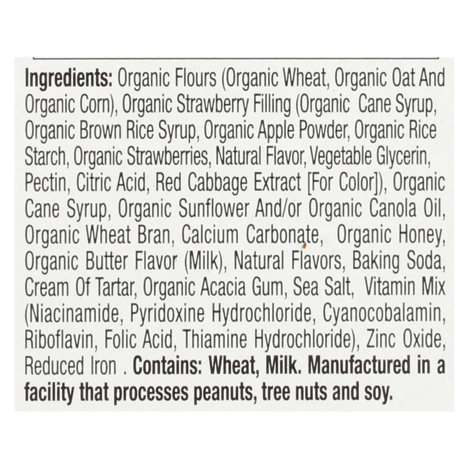 ingredients : organic enriched flour (organic wheat flour, niacin, reduced iron, thiamine mononitrate, riboflavin, folic acid);organic invert cane sugar;organic evaporated cane sugar;water;organic cane syrup;organic sunflower and/or canola oil;organic brown rice syrup;organic wheat bran;organic apple powder;organic rice starch;organic strawberries;organic dried cane syrup;organic corn flour;organic oat flour;natural flavors;organic strawberry flavor;organic glycerin;baking soda;cream of tartar;organic acacia
