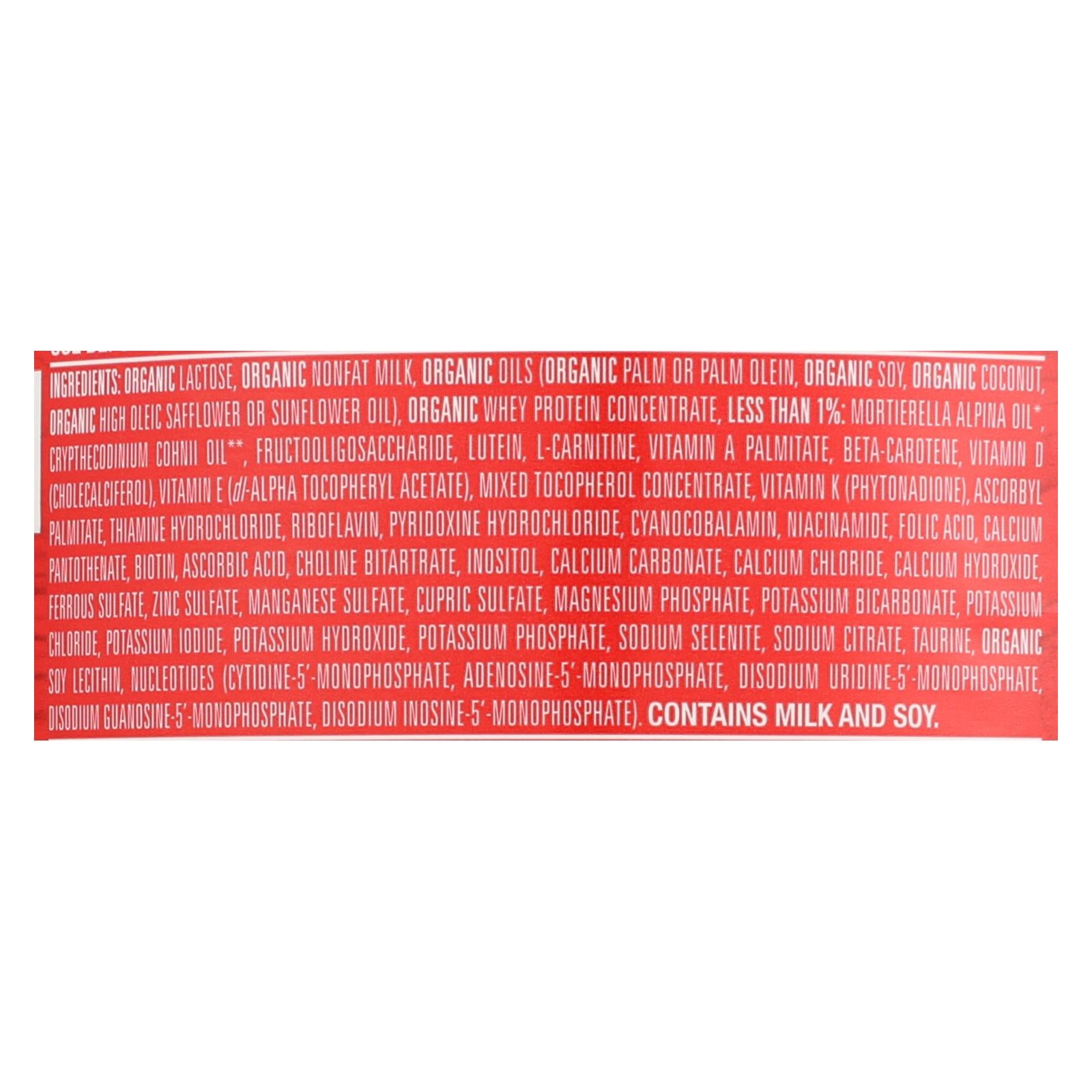 ingredients : organic lactose;organic nonfat milk;organic oils (organic palm or palm olein, organic soy, organic coconut, organic high oleic safflower or sunflower oil);organic whey protein concentrate;less than 1%: mortierella alpina oil*, schizochytrium sp;oil;fructooligosaccharide;lutein;l-carnitine;vitamin a palmitate;beta-carotene;vitamin d (cholecalciferol);vitamin e (dl-alpha tocopheryl acetate);mixed tocopherol concentrate;vitamin k (phytonadione);ascorbyl palmitate;thiamine hydrochloride;riboflavin;p