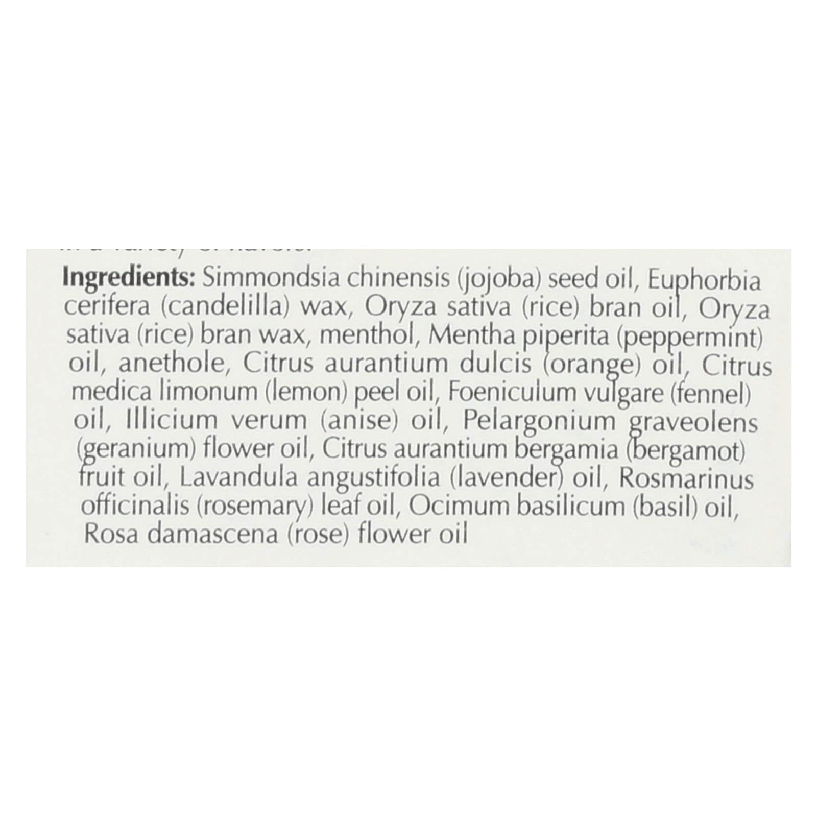 ingredients : simmondsia chinensis;jojoba;seed oil;euphorbia cerifera;candelilla;wax;oryza sativa;rice;bran oil;bran wax;menthol;mentha piperita;peppermint;oil;anethole;citrus aurantium dulcis;orange;citrus medica limonum;lemon;peel oil;foeniculum vulgare;fennel;illicium verum;anise;pelargonium graveolens;geranium;flower oil;citrus aurantium bergamia;bergamot;fruit oil;lavandula angustifolia;lavender;rosmarinus officinalis;rosemary;leaf oil;ocimum basilicum;basil;rosa damascena;rose