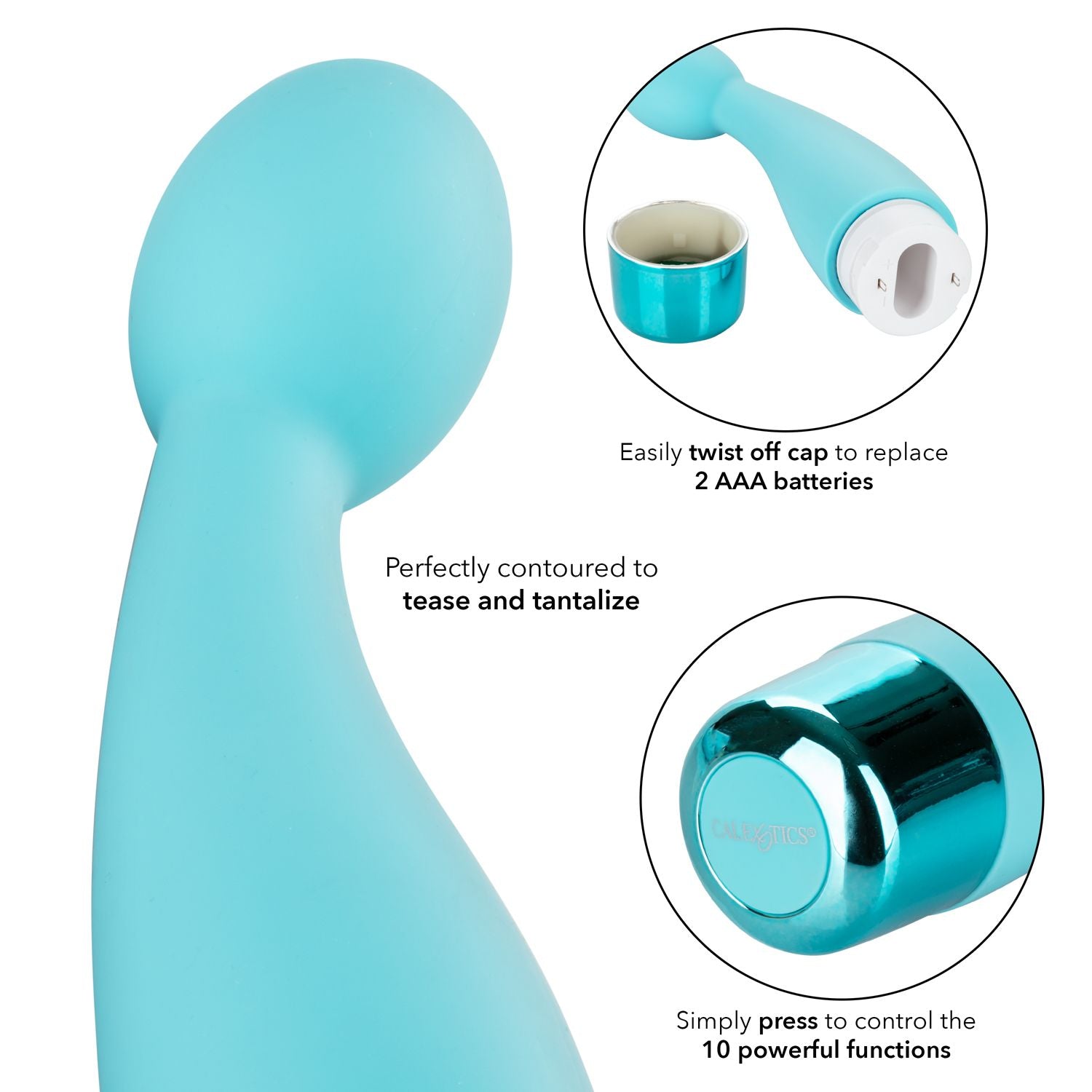 Indulge in personalized pleasure while the curved massager pulses to the rhythm of 10 vivacious vibration, passionate pulsation and erotic escalation. Control this variety of orgasmic options with the easy-touch control button on the base of the massager.
