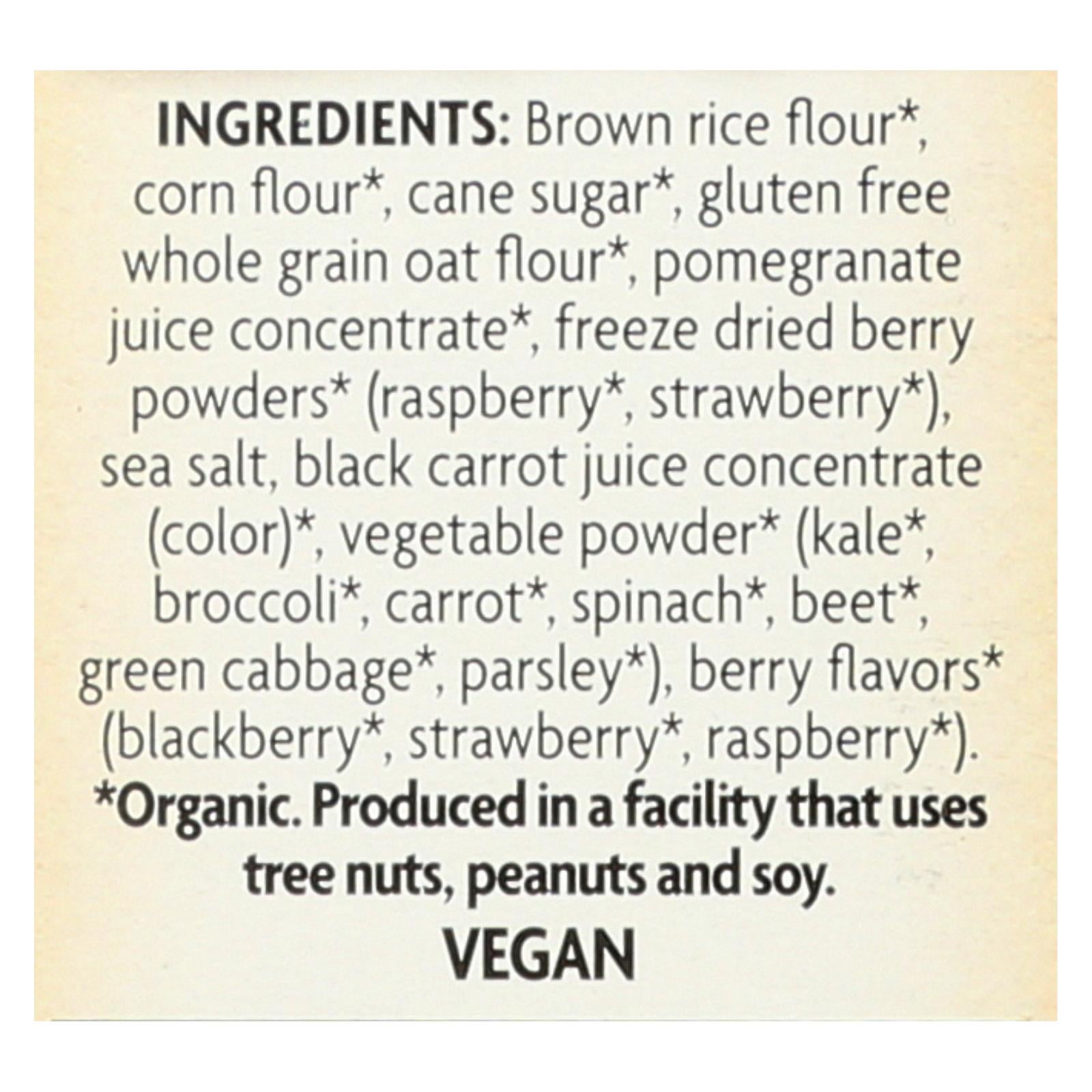 ingredients : brown rice flour;corn flour;cane sugar;gluten free whole grain oat flour;pomegranate juice concentrate;freeze dried berry powders;raspberry;strawberry;sea salt;black carrot juice concentrate;color;vegetable powder;kale;broccoli;carrot;spinach;beet;green cabbage;parsley;berry flavors;blackberry;rasberry