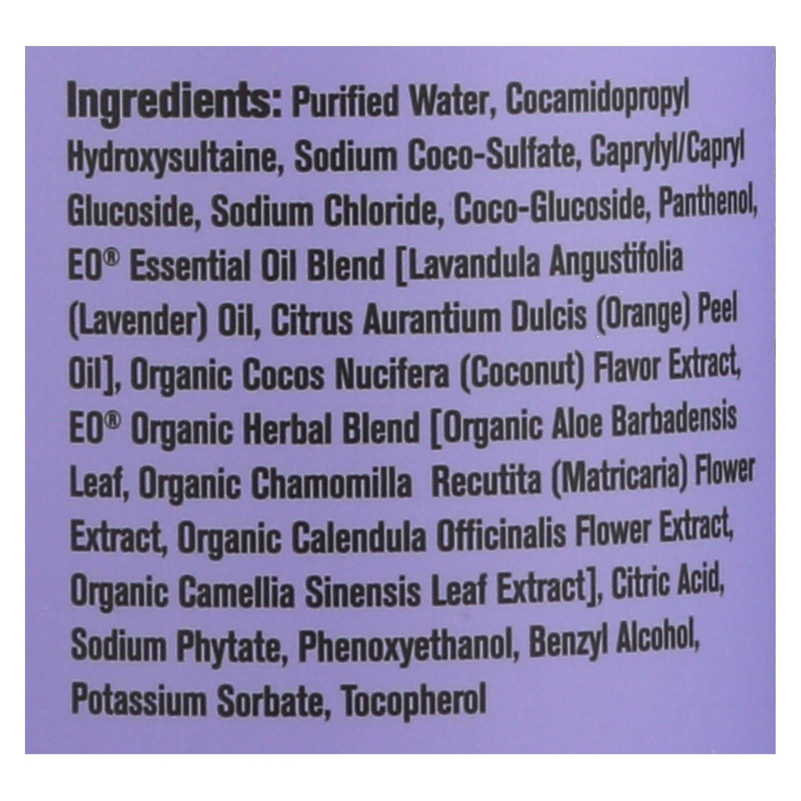 ingredients : purified water;cocamidopropyl hydroxysultaine;sodium coco-sulfate;caprylyl/capryl glucoside;sodium chloride;coco-glucoside;panthenol;eo® essential oil blend [lavandula angustifolia;lavender;oil;citrus aurantium dulcis;orange;peel oil];organic cocos nucifera;coconut;flavor extract;eo® organic herbal blend [organic aloe barbadensis leaf;organic chamomilla recutita;matricaria;flower extract;organic calendula officinalis flower extract;organic camellia sinensis leaf extract];citric acid;sodium phyta