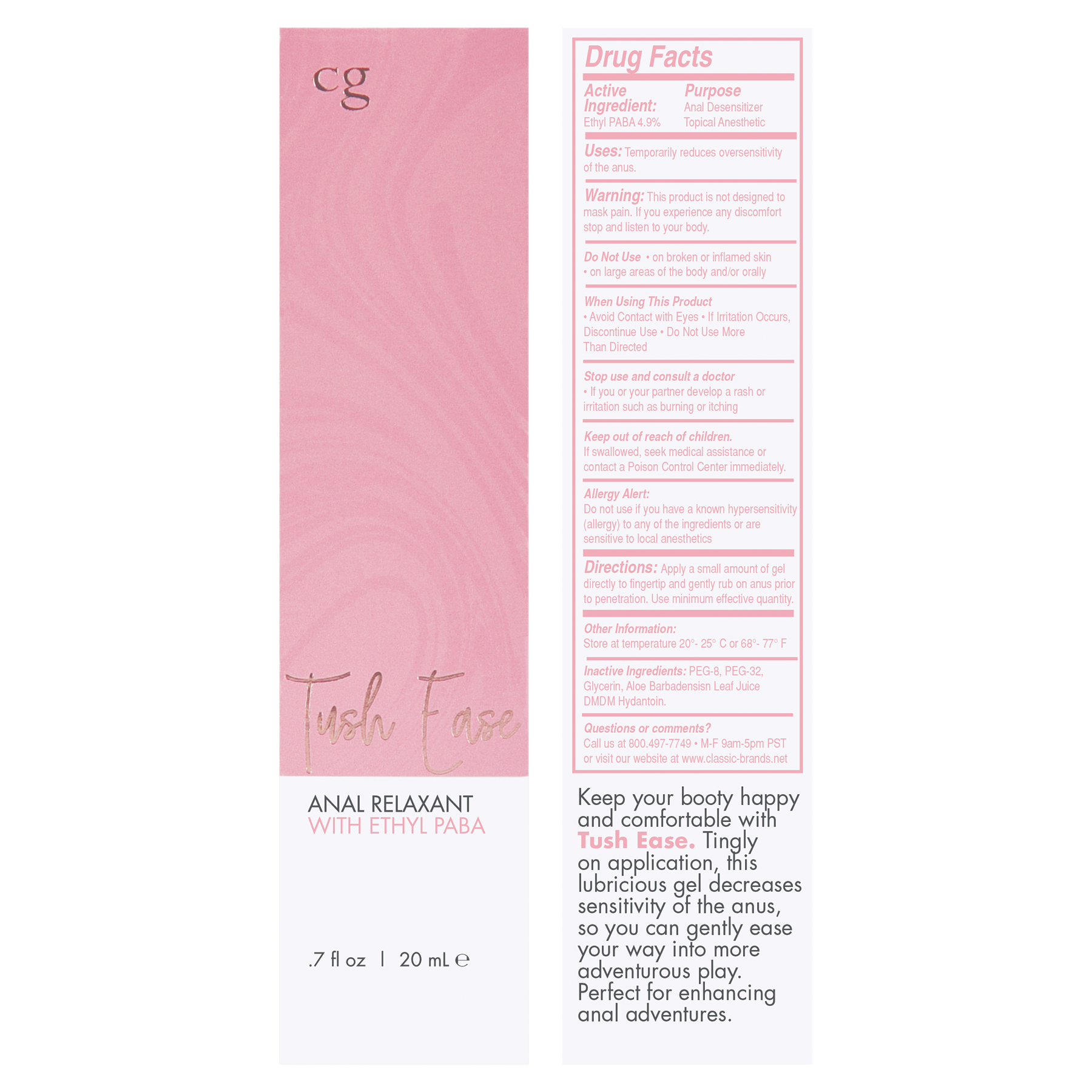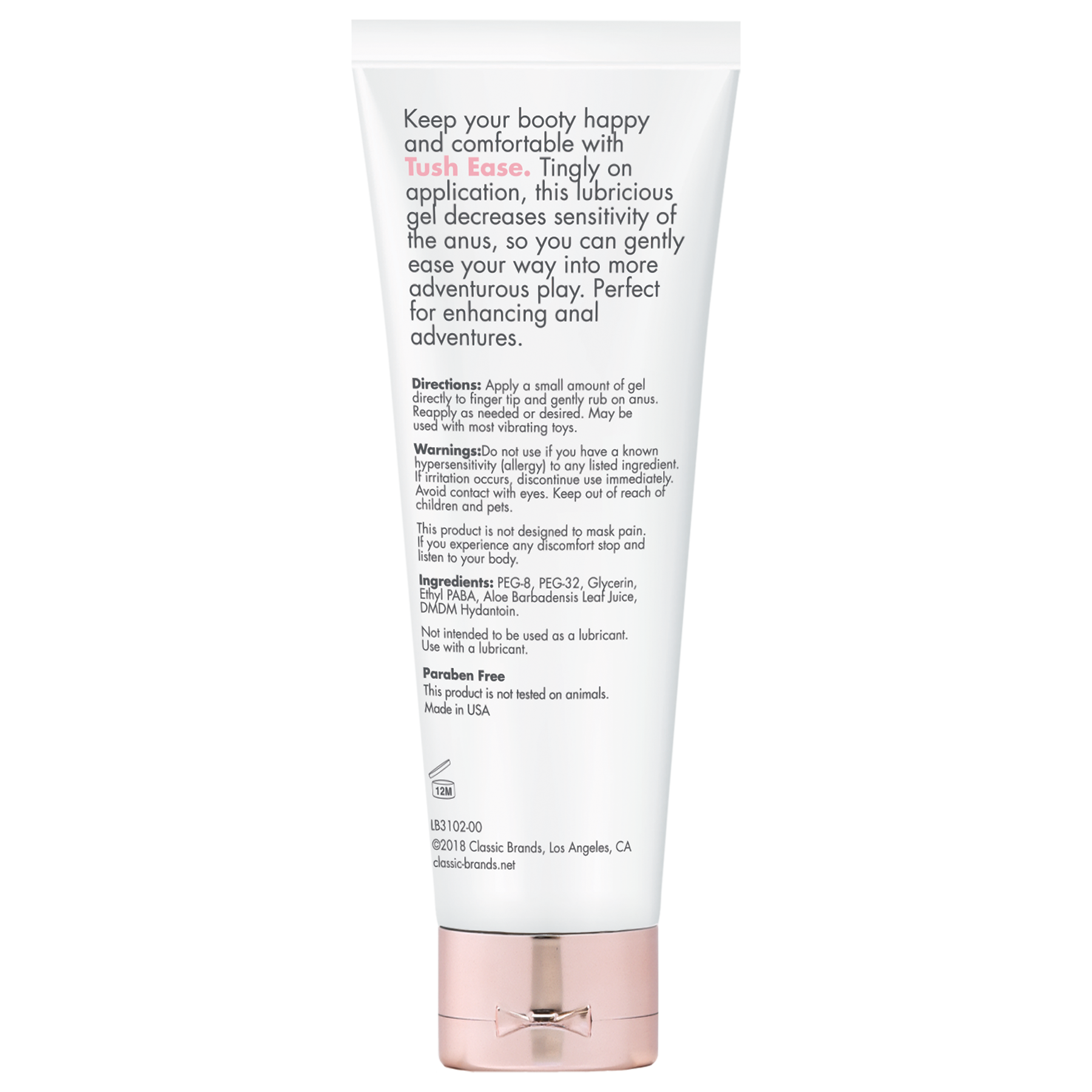 Keep your booty happy and comfortable with Tush Ease. Tingly on application, this lubricious gel decreases sensitivity of the anus, so you can gently ease your way into more adventurous play. Perfect for enhancing anal adventures Apply a small amount of gel directly to finger tip and gently rub on anus 10-15 minutes prior to penetration. Reapply as needed or desired. May be used with most vibrating toys. This product is not designed to mask pain. If you experience any discomfort stop and listen to your body. Tingly serum, ideal for naturally decreasing anal sensitivity. Formulated with natural ingredients. Fragrance Free. Made in the USA. This product does not contain benzocaine.
