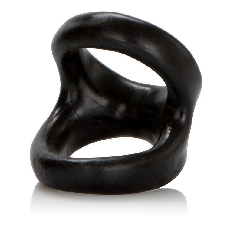 Stretchy and comfortable dual enhancer ring. Built-in scrotum support. TPR. 1"/2.5 cm (penis ring), 1.25"/3.25 cm (scrotum ring), 2" x 2.25"/5 cm x 6.25 cm (overall). From CalExotics.