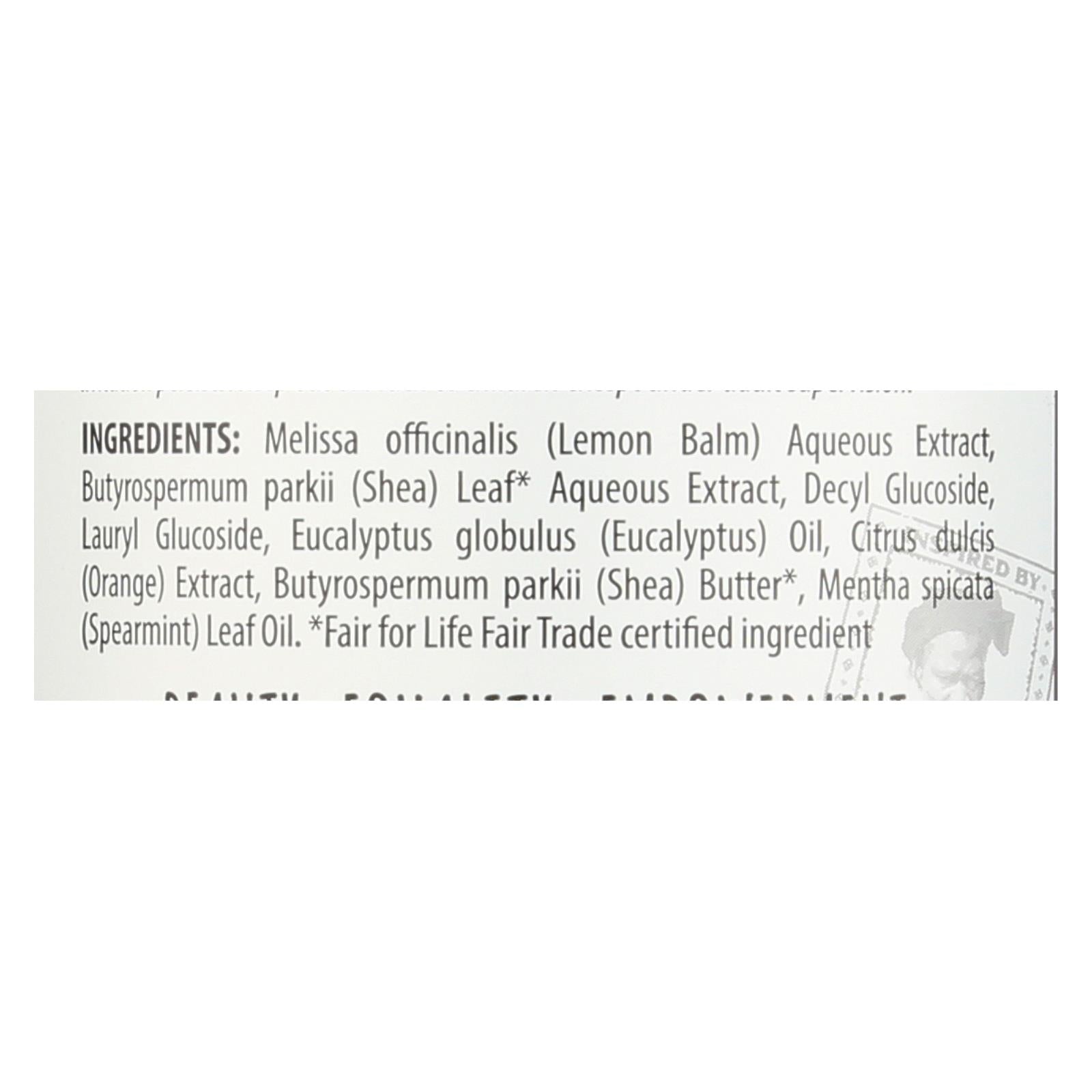 ingredients : melissa officinalis;lemon balm;aqueous extract;butyrospermum parkii;shea;leaf aqueous extract;decyl glucoside;lauryl glucoside;eucalyptus globulus;eucalyptus;oil;citrus dulcis;orange;extract;butter;mentha spicata;spearmint;leaf oil