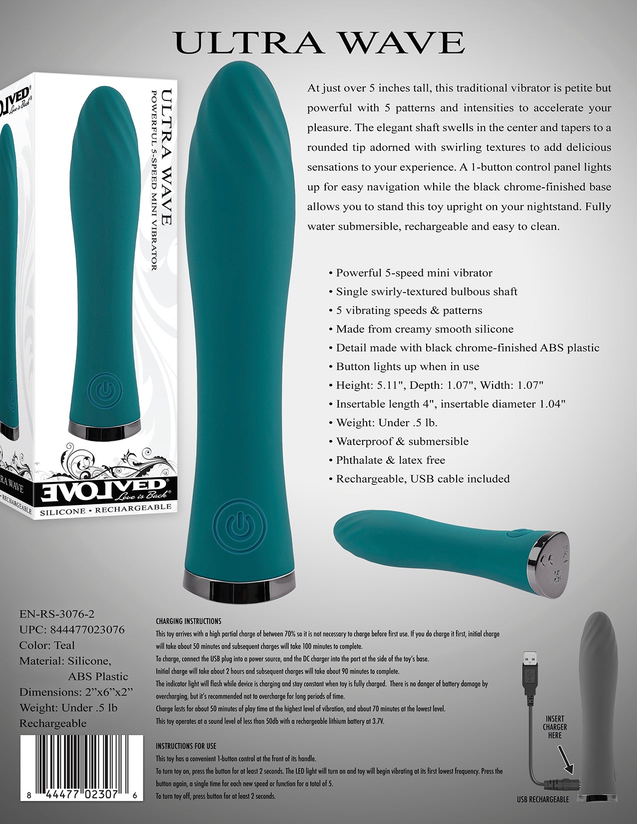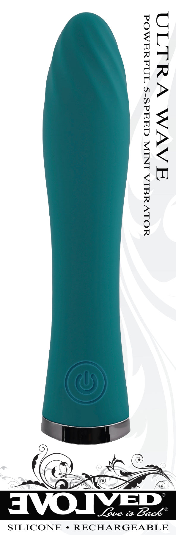 Evolved Ultra Wave Green Vibrator. The Ultra Wave at just over 5 inches tall, this traditional vibrator is petite but powerful with 5 patterns and intensities to accelerate your pleasure. The elegant shaft swells in the center and tapers to a rounded tip adorned with swirling textures to add delicious sensations to your experience. A 1 button control panel lights up for easy navigation while the black chrome finished base allows you to stand this sex toy upright on your nightstand. Fully water submersible, rechargeable and easy to clean.