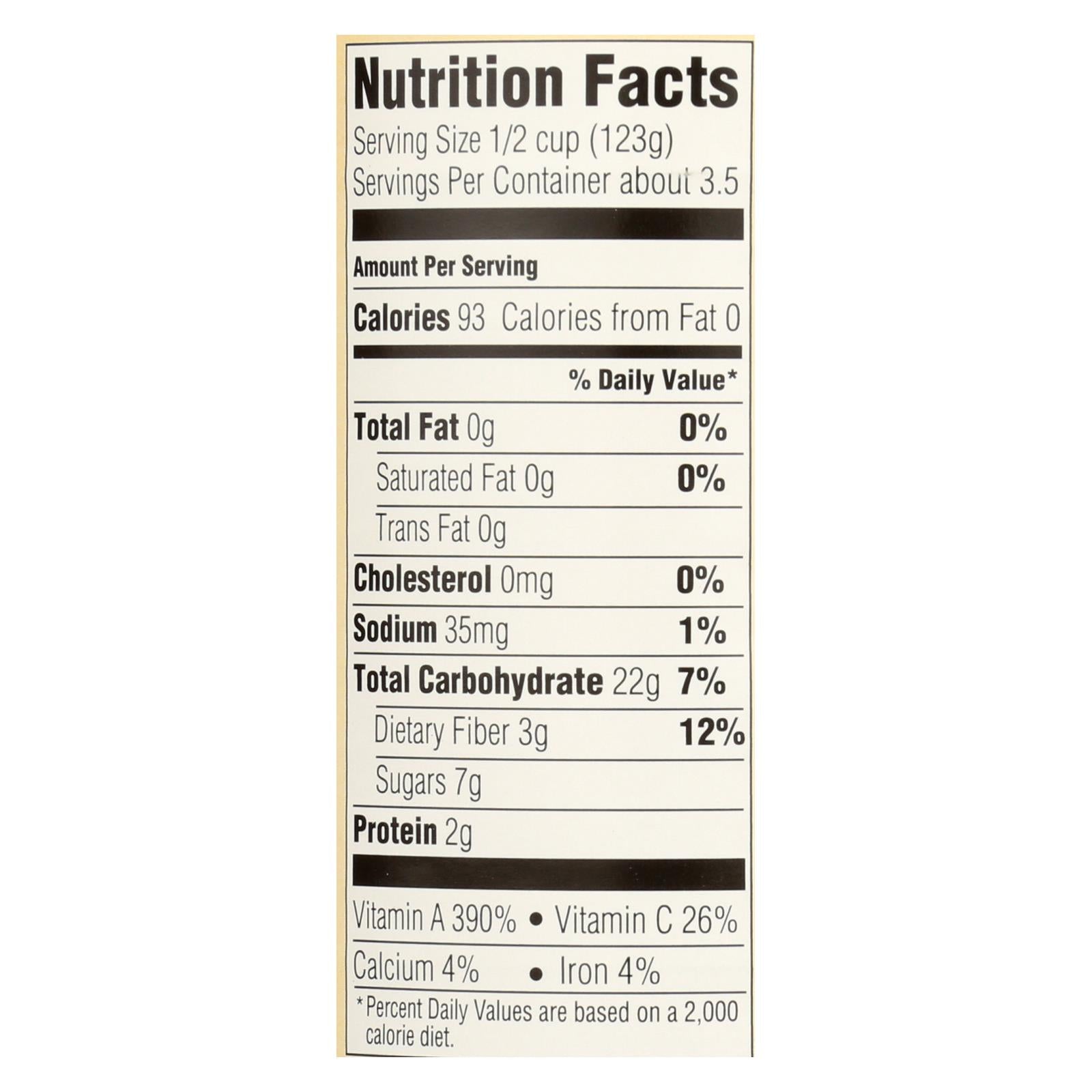 Farmer's market organic sweet potato puree is a 100% usda-certified organic product. This puree comes packed in one 15 oz. Can and is verified non-gmo. This certified kosher-parve product contains 0 g. Of trans fat, saturated fat and cholesterol. Each serving has 3 g. Of dietary fiber and just 93 calories.