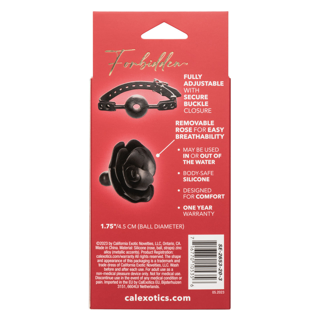 Forbidden Removable Rose Gag from California Exotic Novelties. Introducing the Forbidden Removable Rose Gag, a seductive fetish accessory designed to enhance your erotic play. This ball gag features a unique removable rose, allowing for easy breathability and personalized experiences. The gag is fully adjustable with a secure buckle closure, ensuring a comfortable and secure fit for all users. Crafted from body safe Silicone, it provides a soft and gentle feel against the skin while maintaining a hypoallergenic and easy to clean nature. Experience the thrill of submission and indulge in the pleasures of restraint play with the Forbidden Removable Rose Gag. Surrender control, embrace your desires, and embark on a journey of intimate discovery into the world of BDSM with this exquisite gag.