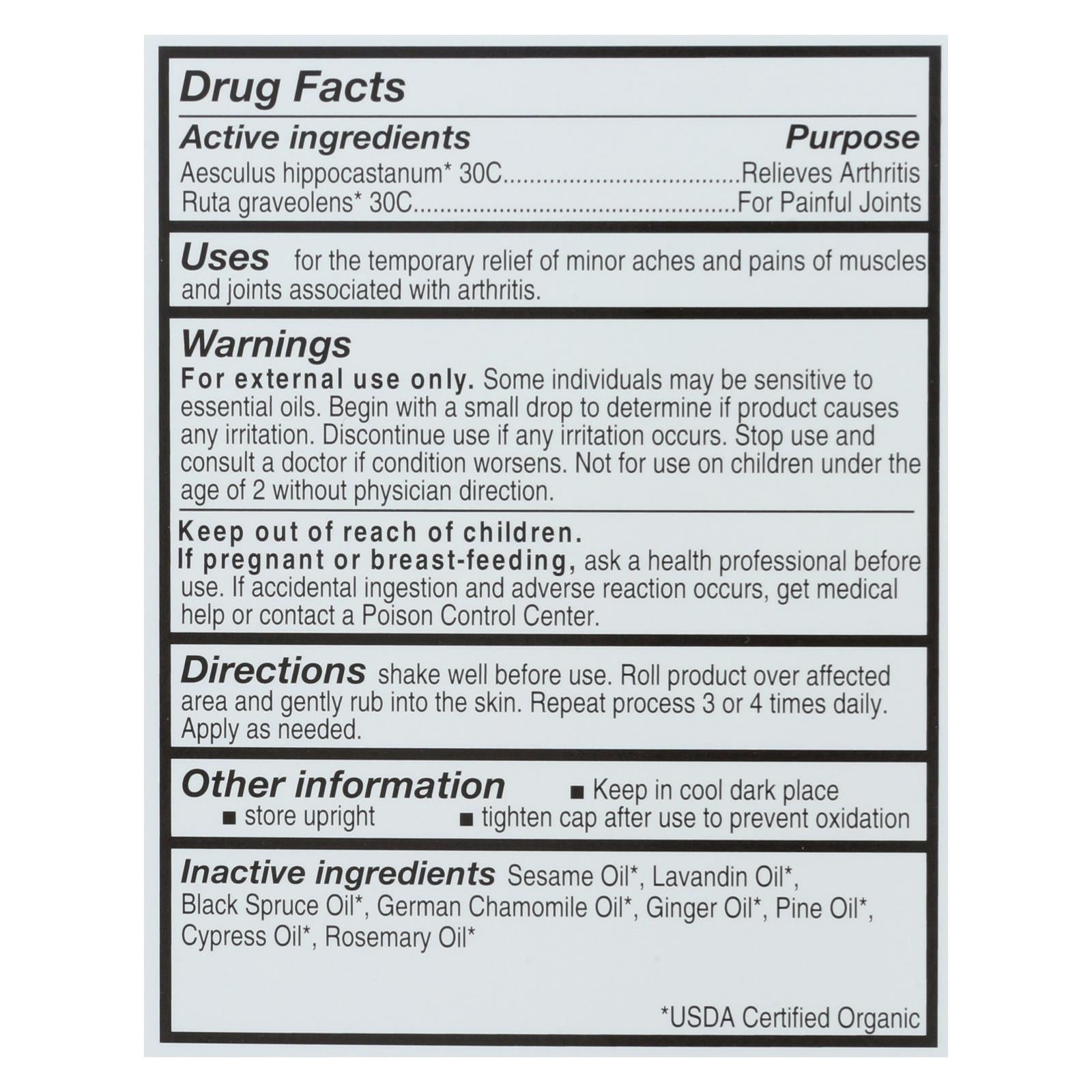 ingredients : aesculus hippocastanum* 30 c purpose relives arthritis ruta graveolens* 30c purpose for painful joints;sesame oil;lavandin oil;black spruce oil;german chamomile oil;ginger oil;pine oil;cypress oil;rosemary oil