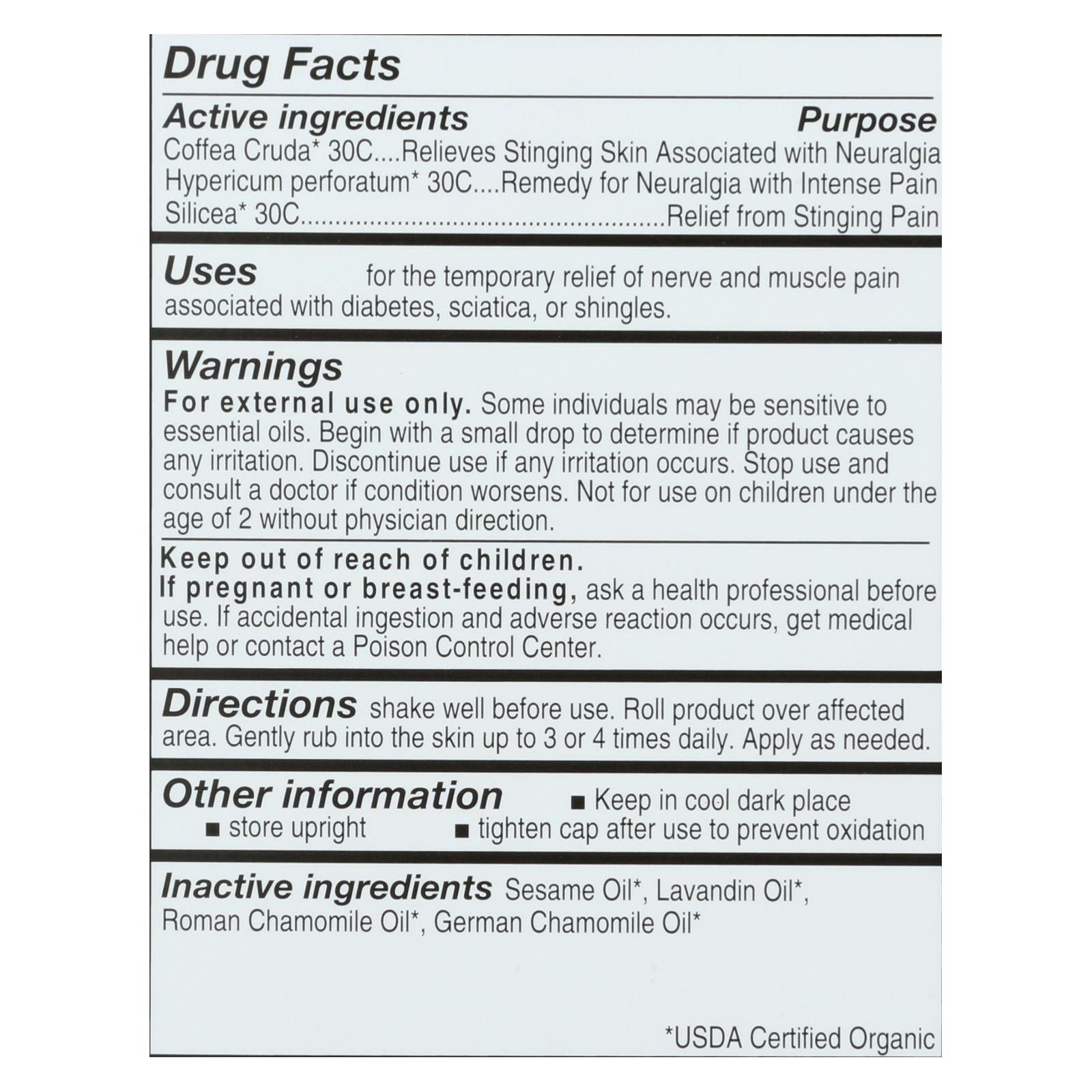 ingredients : sesame oil;lavandin oil;roman chamomile oil;german chamomile oil;coffea cruda* 30c....relives stinging skin associated with neuralgia hypericum perforatum * 30c....remedy for neuralgia with intense pain silicea* 30c purpose relief from stinging pain