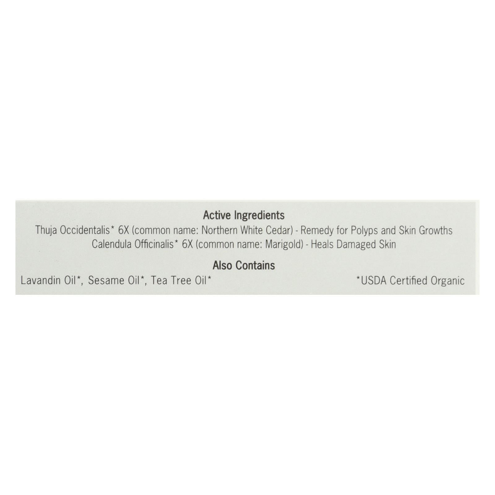ingredients : thuja occidentalis* 6x purpose remedy for polyps and skin growths calendula officinalis* 6x purpose heals damaged skin;lavandin oil;sesame oil;tea tree oil
