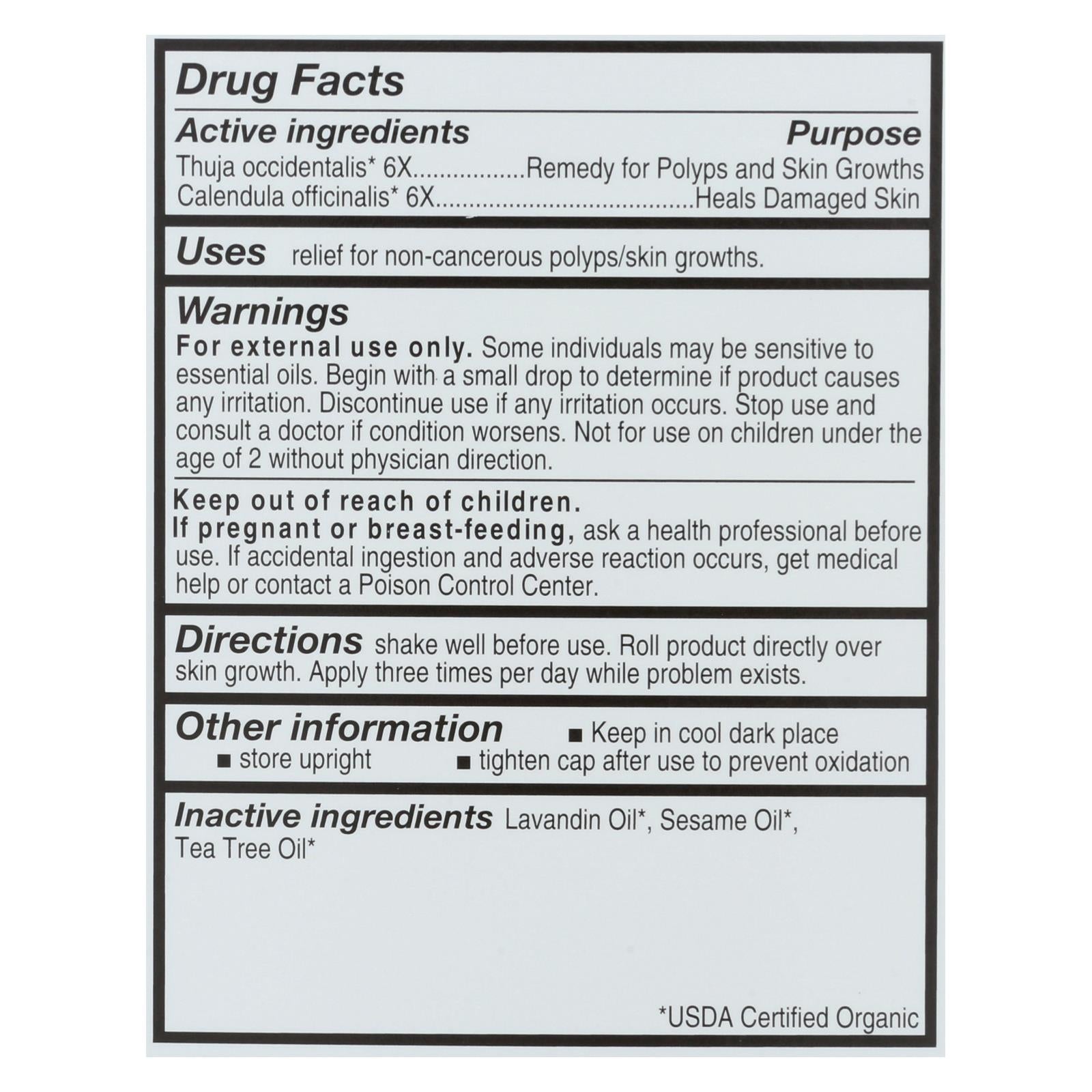 ingredients : lavandin oil;sesame oil;tea tree oil;thuja occidentalis* 6x purpose remedy for polyps and skin growths calendula officianlis* 6x purpose heals damaged skin