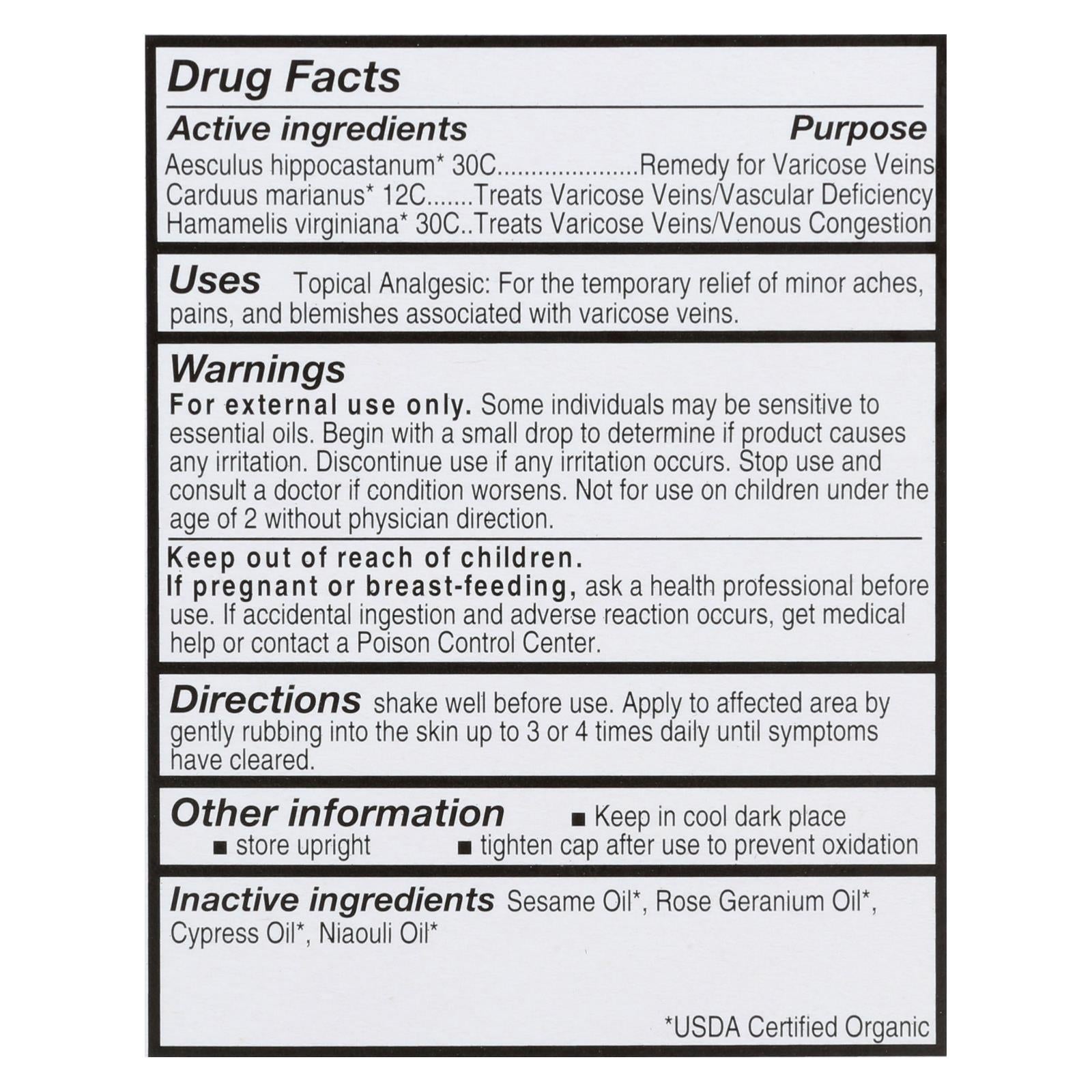 ingredients : sesame oil;rose geranium oil;cypress oil;niaouli oil;aesculus hippocastanum* 30c purpose remedy for varicose veins carduus marianus* 12c purpose treats varicose veins/vascular deficiency hamamelis virginiana* 30c purpose treats varicose veins/venous congestion