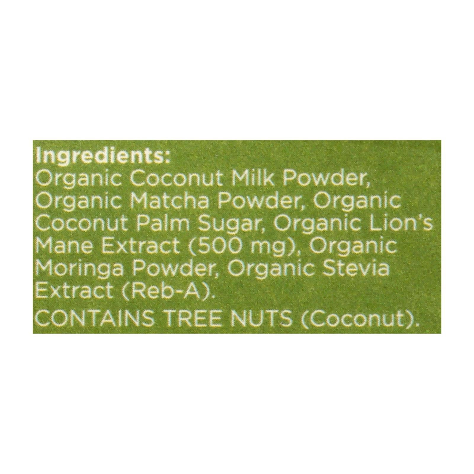 ingredients : organic coconut milk powder;organic matcha powder;organic coconut palm sugar;organic lion's e extract (500 mg);organic moringa powder;organic stevia tract (reb-a)