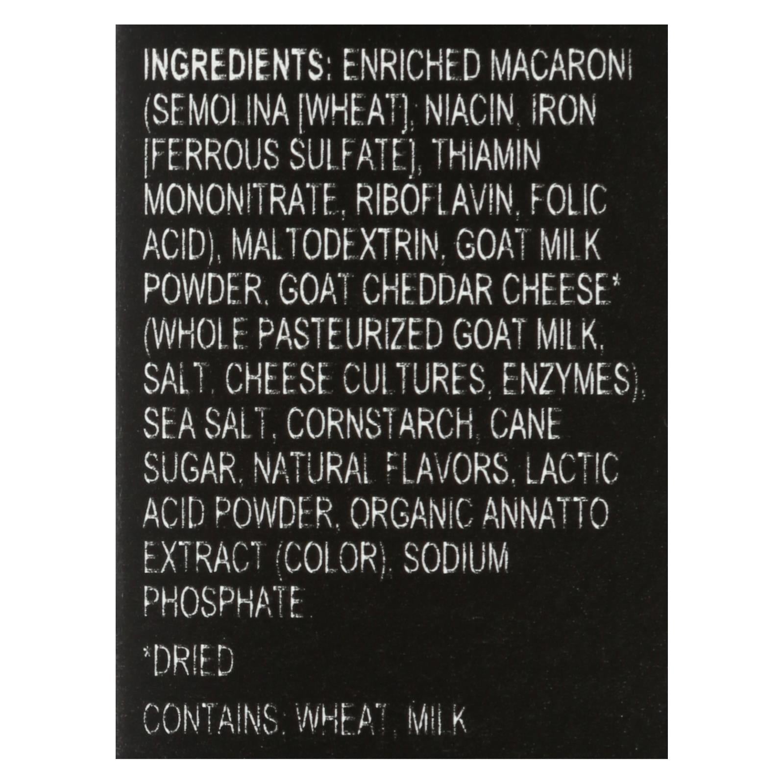 ingredients : enriched macaroni;semolina [wheat];niacin;iron [ferrous sulfate];thiamin mononitrate;riboflavin;folic acid;maltodextrin;goat milk powder;goat cheddar cheese;whole pasteurized goat milk;salt;cheese cultures;enzymes;sea salt;cornstarch;cane sugar;natural flavors;lactic acid powder;organic annatto extract;color;sodium phosphate