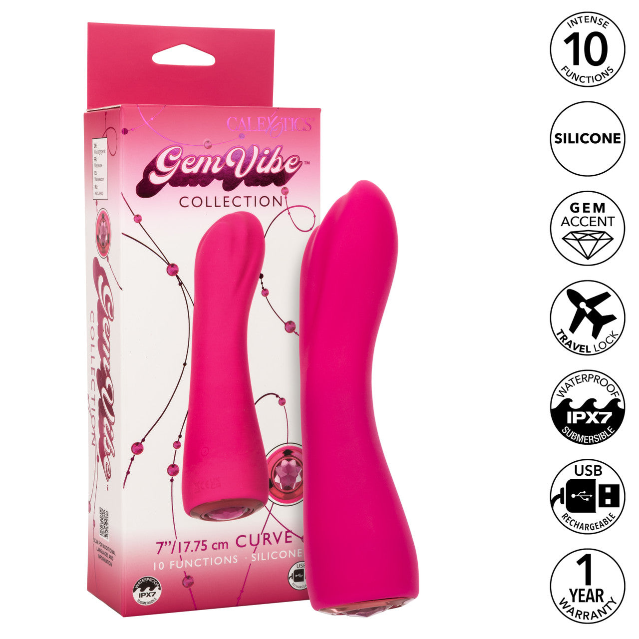 Features: Phthalate Free, Rechargeable, Vibrates Waterproof Rating IPX7. Power Source USB Rechargeable cord included. Material Type: Silicone Massager, ABS Plastic with Metallic Plating decor, Acrylic Gem. Measurements: 7 inches by 1.75 inches. Bulk weight 6 ounces. Package: 8.6 ounces. Package: 2 inches by 3.5 inches by 9.75 inches. Maximum Run Time: 100 minutes. Maximum Charging Time: 90 minutes. Functions: 10. Categories: Vibrators, Clitoral, Eco-Friendly Sex Toys, Rechargeable Vibrators, Sex Toys for Women, Clit Cuddlers. 2024.