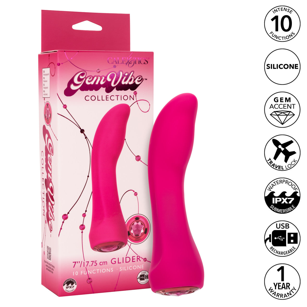 Gem Vibes Collection Glider Pink Vibrator from California Exotic Novelties. Step into a world where elegance meets ecstasy with the Gem Vibe Collection Glider. This luxurious toy is designed for those who crave a touch of glamour in their pleasure pursuits. The toy stands apart with its uniquely shaped tip, perfectly designed to enhance foreplay and escalate pleasure. It is a testament to the fine art of intimate exploration, offering an experience that is as visually stunning as it is sensually gratifying. The heart of the Glider's allure lies in its 10 intense functions of vibration, pulsation, and escalation. Each setting is an invitation to a new realm of pleasure, whether you desire a gentle flutter or a powerful wave, this toy responds to your every whim, providing personalized ecstasy at your fingertips. The sparkling gem inlaid controller is not just a feature; it's a statement, adding a touch of opulence to your every encounter. Crafted from body safe materials, it is 100% waterproof with an IPX7 rating, offering the freedom to indulge in your deepest desires wherever and whenever. The state of the art memory chip is a thoughtful addition, resuming on the last function used for seamless continuation in your pleasure journey. This feature ensures that your favorite settings are always just a touch away, ready to transport you back to moments of bliss. Designed with both pleasure and practicality in mind, the toy comes with a security travel lock feature, ensuring discretion during your adventures. USB rechargeable for convenience, it boasts a complete charge in just 1.5 hours. With the capacity to run for 45 minutes on high speed and an impressive 100 minutes on low speed, the Gem Vibe Collection Glider is a companion in your journey of self discovery and indulgence, a jewel in the crown of your personal collection.