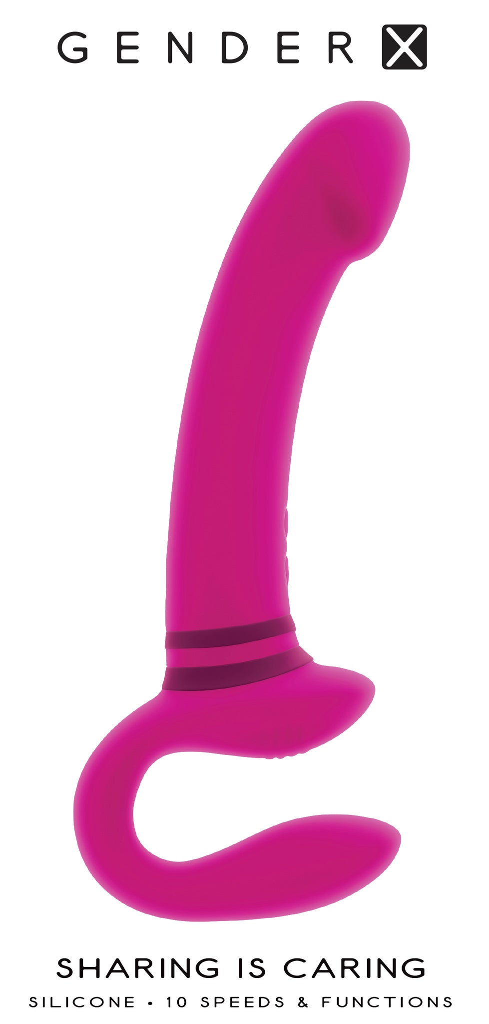 Gender X Sharing Is Caring Wearable Strapless Strap On from Evolved Novelties. This unique double ended Sex Toy features a tall, gently arched main shaft with a crowned tip on one side, and a flexible wearable C-Shape on the other side. Each end has its own independently controlled motor to increase pleasure possibilities, even underwater as it is completely submersible.