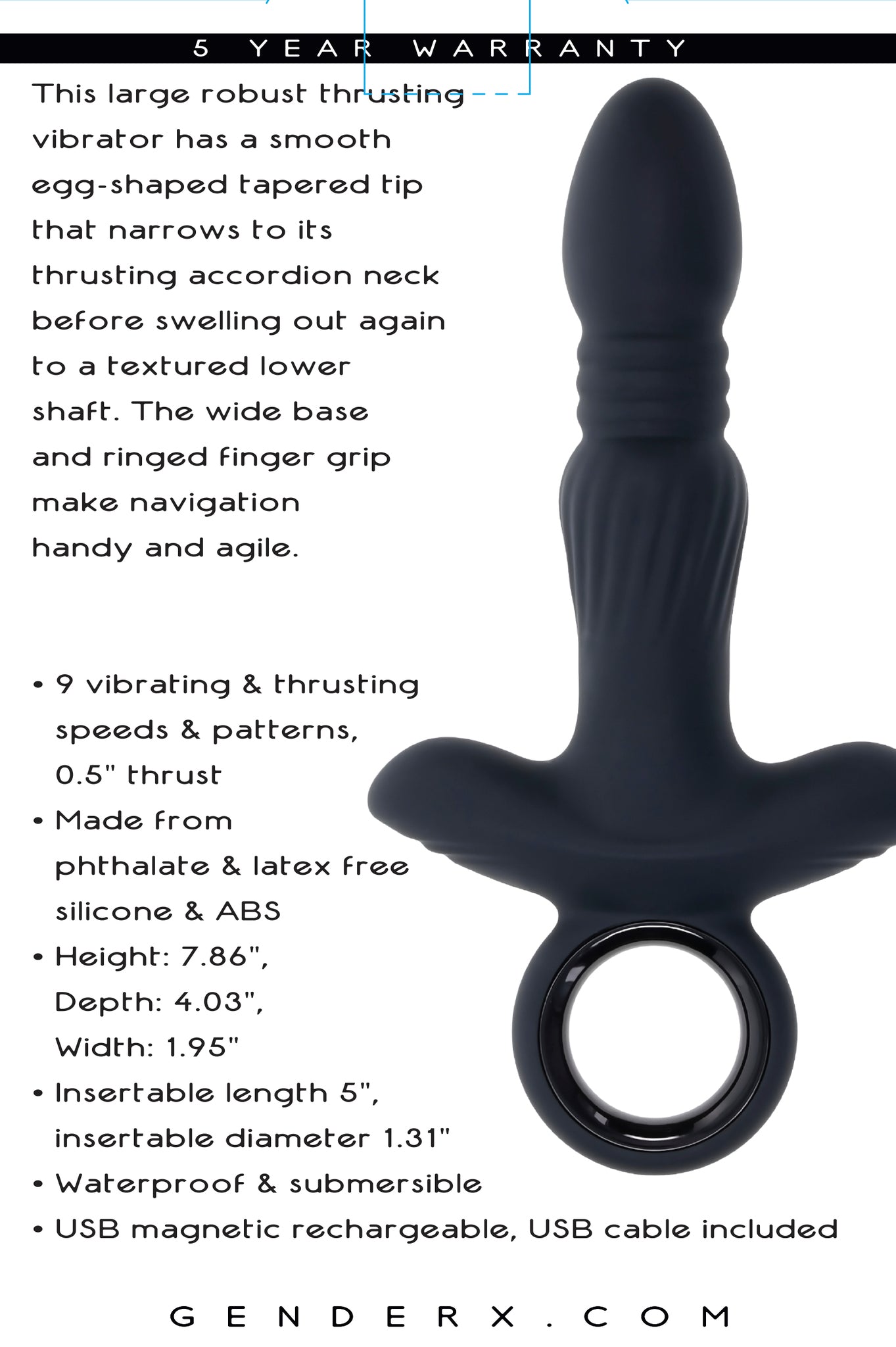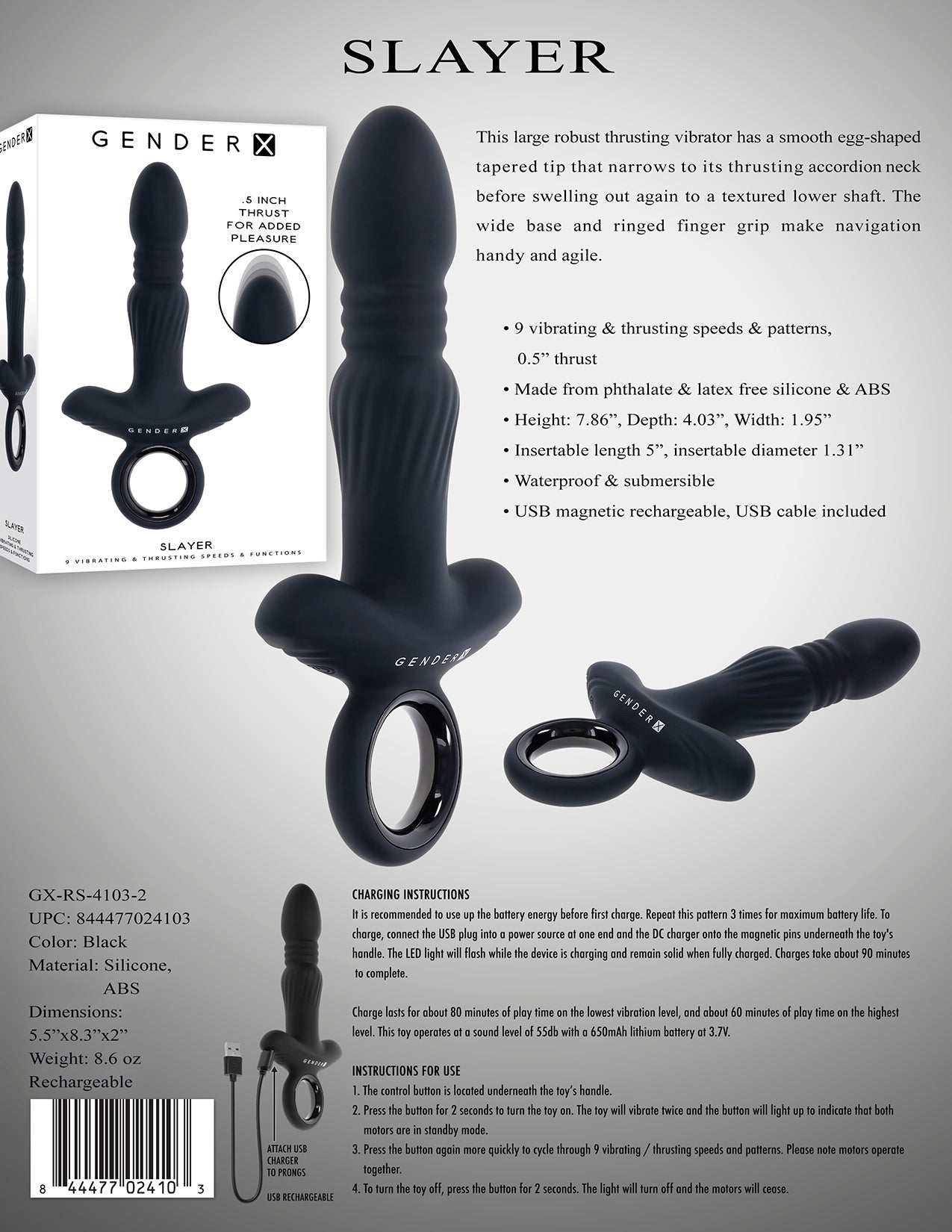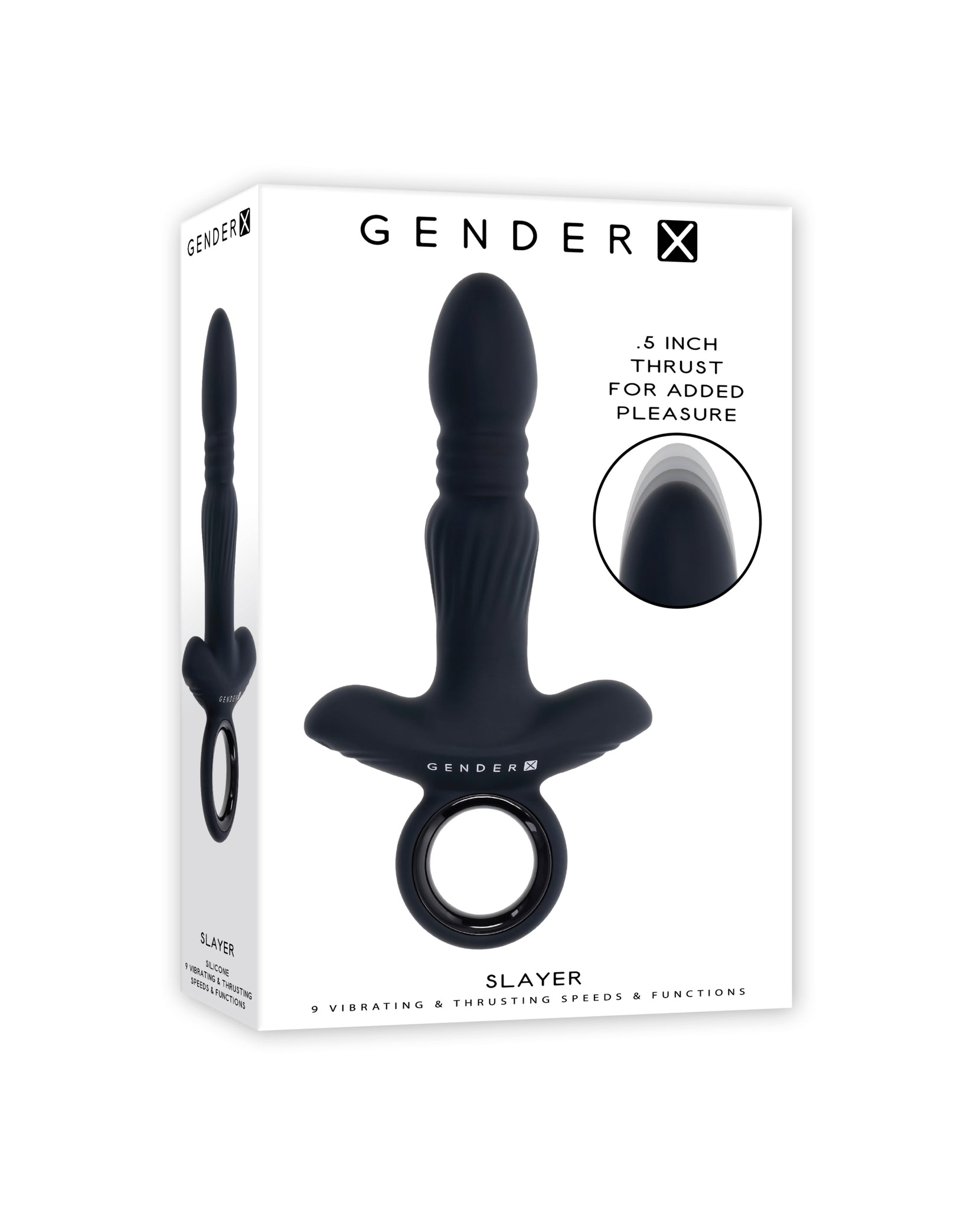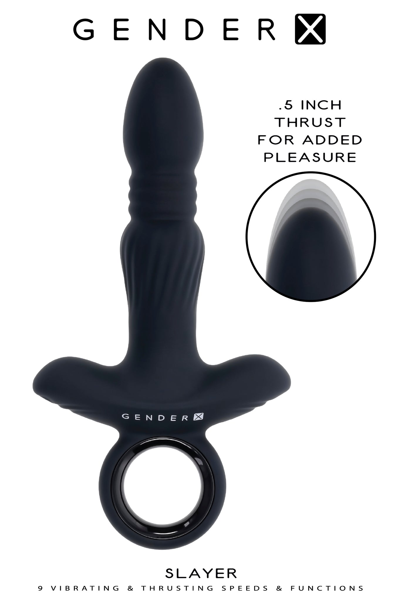 Gender X Slayer Black Toy from Evolved Novelties. This large robust thrusting Vibrator has a smooth egg shaped tapered tip that narrows to its thrusting accordion neck before swelling out again to a textured lower shaft. The wide base and ringed finger grip make navigation handy and agile. Description: 9 vibrating and thrusting speeds and patterns, 0.5 inch thrust. Made from body safe phthalate free and latex free Silicone and ABS Plastic. Height 7.86 inches, Depth 4.03 inches, Width 1.95 inches. Insertable length 5 inches, insertable diameter 1.31 inches. Waterproof and submersible. USB Magnetic Rechargeable, USB Cable included. Categories: Anal Toys, Prostate Massagers, P-Spot Stimulators, Vibrators, Sex Toys for Men, Eco-Friendly Sex Toys, Rechargeable Vibrators. 2024.