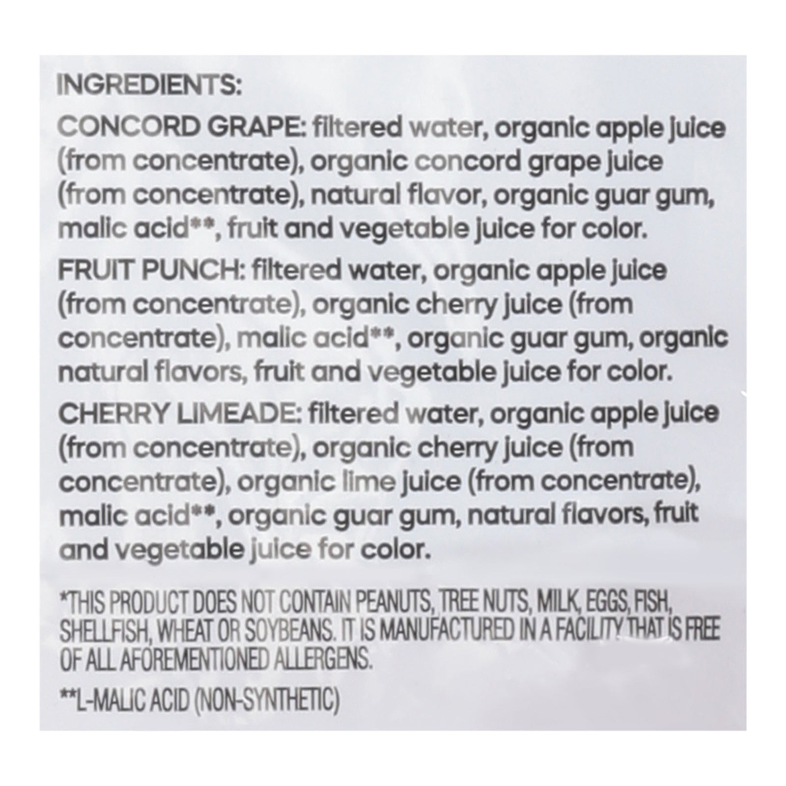 ingredients : cherry limeade: filtered water, organic apple juice (from concentrate), organic cherry juice (from concentrate), organic lime juice (from concentrate), malic acid**, organic guar gum, natural flavors, fruit and vegetable juice for color;concord grape: filtered water, organic apple juice (from concentrate), organic concord grape juice (from concentrate), natural flavor, organic guar gum, malic acid**, fruit and vegetable juice for color;fruit punch: filtered water, organic apple juice (from conce