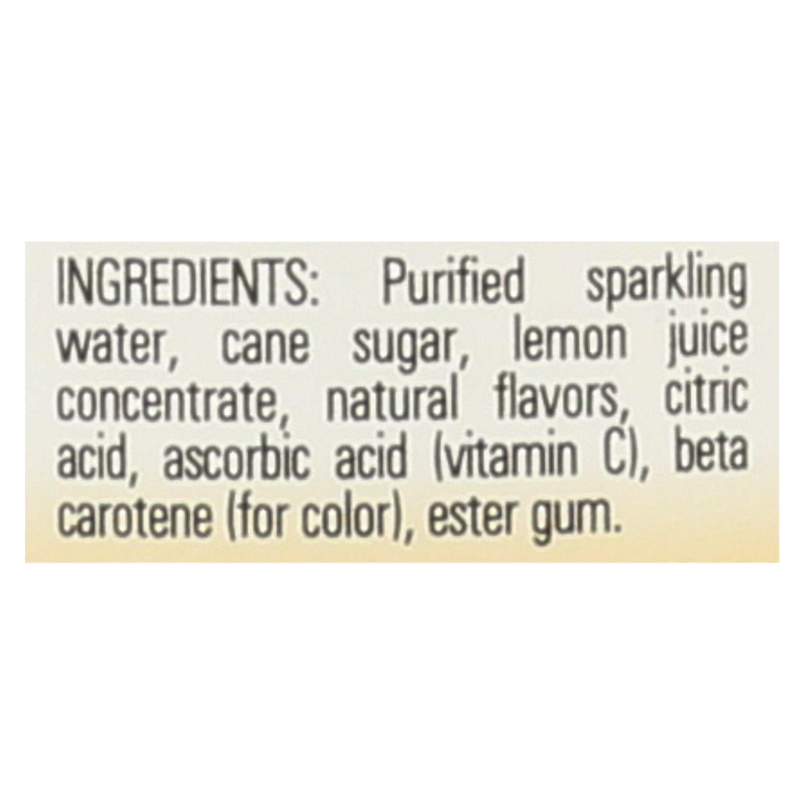 ingredients : purified sparkling water;cane sugar;lemon juice concentrate;natural flavors;citric acid;ascorbic acid;vitamin c;beta carotene;for color;ester gum