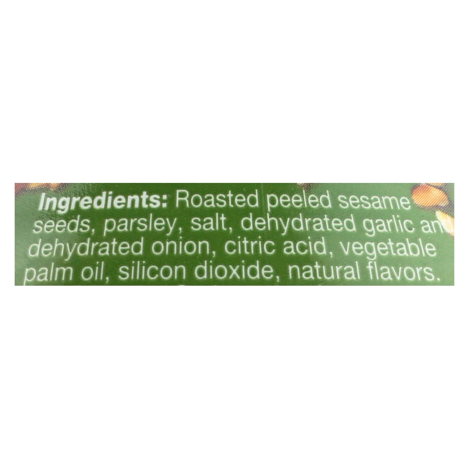 ingredients : roasted peeled sesame seeds;parsley;salt;dehydrated garlic and dehydrated onion;citric acid;vegetable palm oil;silicon dioxide;natural flavors