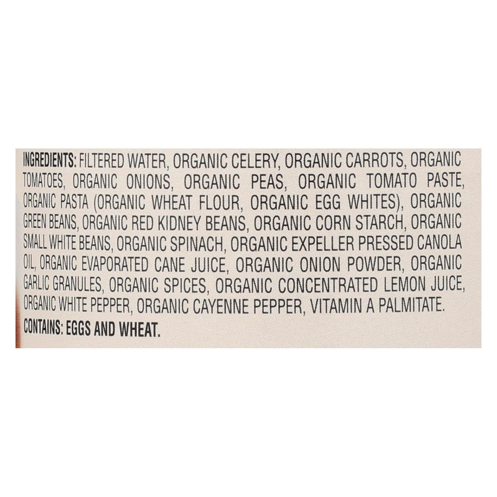 ingredients : filtered water;organic celery;organic carrots;organic tomatoes in organic tomato juice;organic onions;organic peas;organic tomato paste;organic pasta (organic wheat flour, organic egg whites);organic green beans;organic red kidney beans;organic corn starch;organic small white beans;organic spinach;organic expeller pressed canola oil;organic evaporated cane sugar;organic spices;organic onion powder;organic garlic granules;organic concentrated lemon juice;vitamin a palmitate