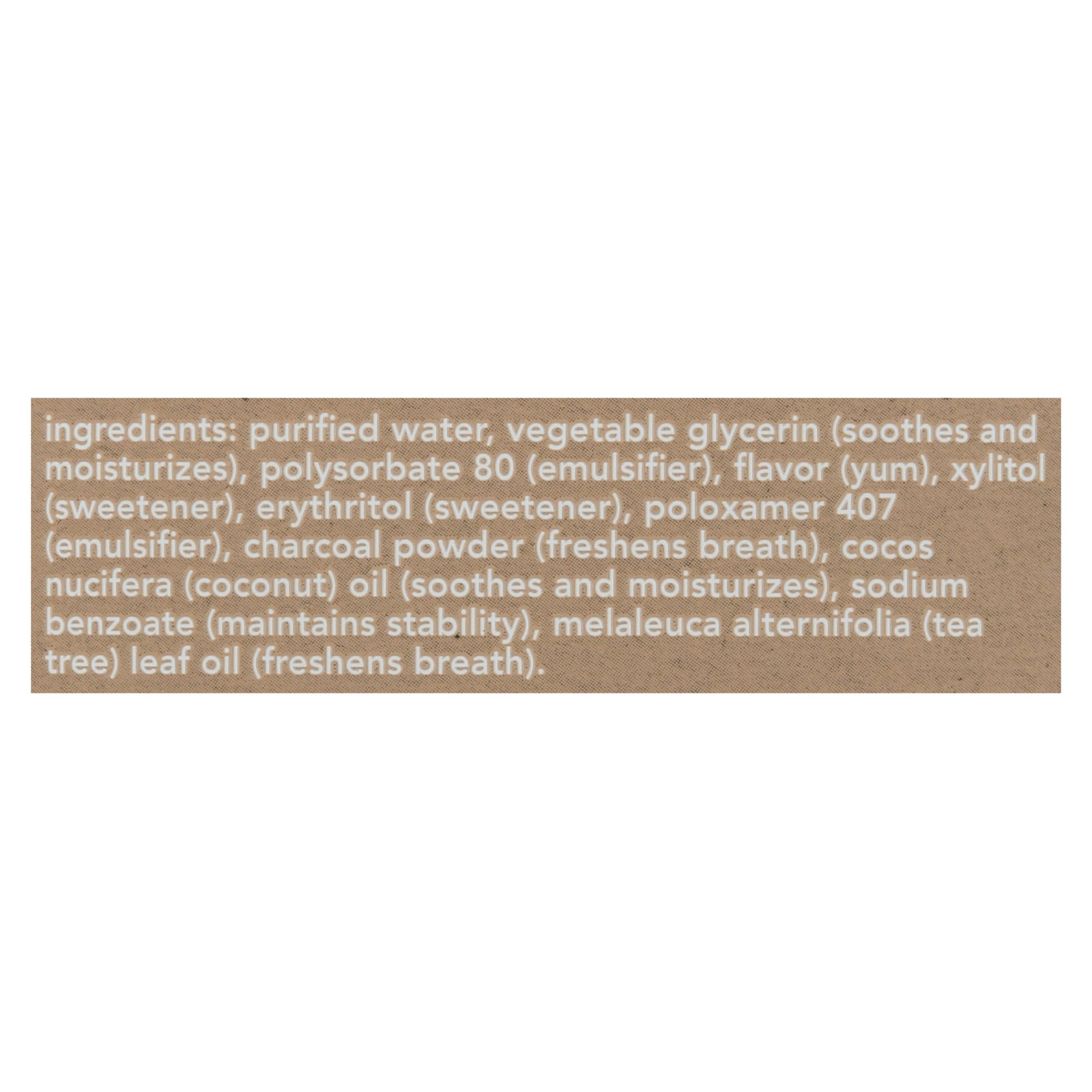 Naturally friendly. Activated charcoal extra freshening mouthwash. Natural fresh mint with coconut oil. Epic freshening. Rock tastebuds. Moisturizes mouth. Take a swish on the wild side. Black rinse might look weird, but it works brilliantly. Activated charcoal (made from sustainable bamboo) naturally freshens breath, while coconut oil moisturizes your mouth. But wait, there's more: xylitol and tea tree oil will rock your world, and bonus, there's zero alcohol. Now that's friendly. No alcohol. No dyes. No artificial sweeteners. No sls/sulfates. No brainer. For your protection, cap sealed with printed band. Choose friendly.