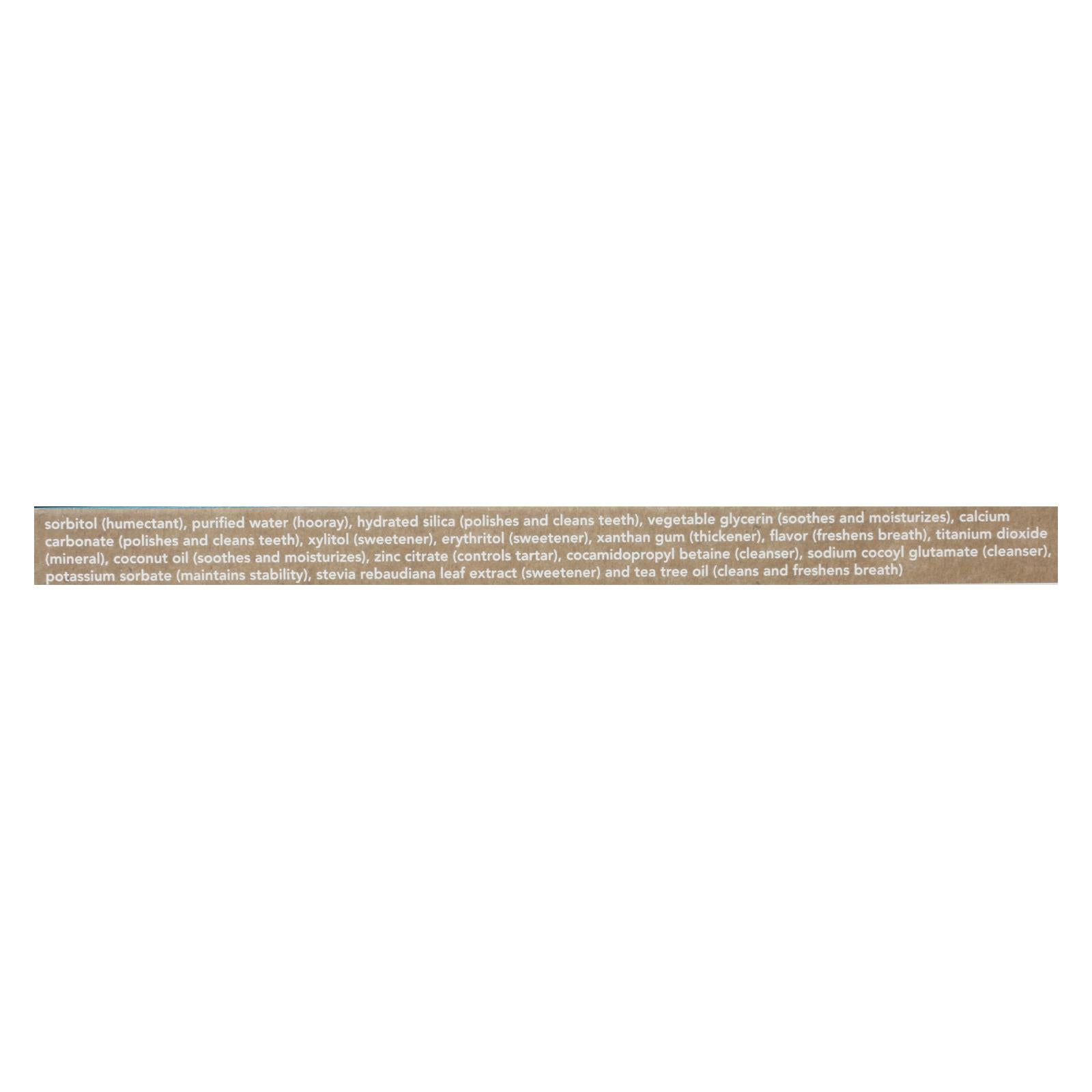 ingredients : sorbitol;humectant;purified water;hooray;hydrated silica;polishes and clean teeth;vegetable glycerin;soothes and moisturizes;calcium carbonate;xylitol;sweetener;erythritol;xanthan gum;thickener;flavor;freshens breath;titanium dioxide;mineral;coconut oil;zinc citrate;controls tartar;cocamidopropyl betaine;cleanser;sodium cocyl glutamate;potassium sorbate;maintains stability;stevia rebaudiana leaf extract;and tea tree oil;cleans and freshness breath