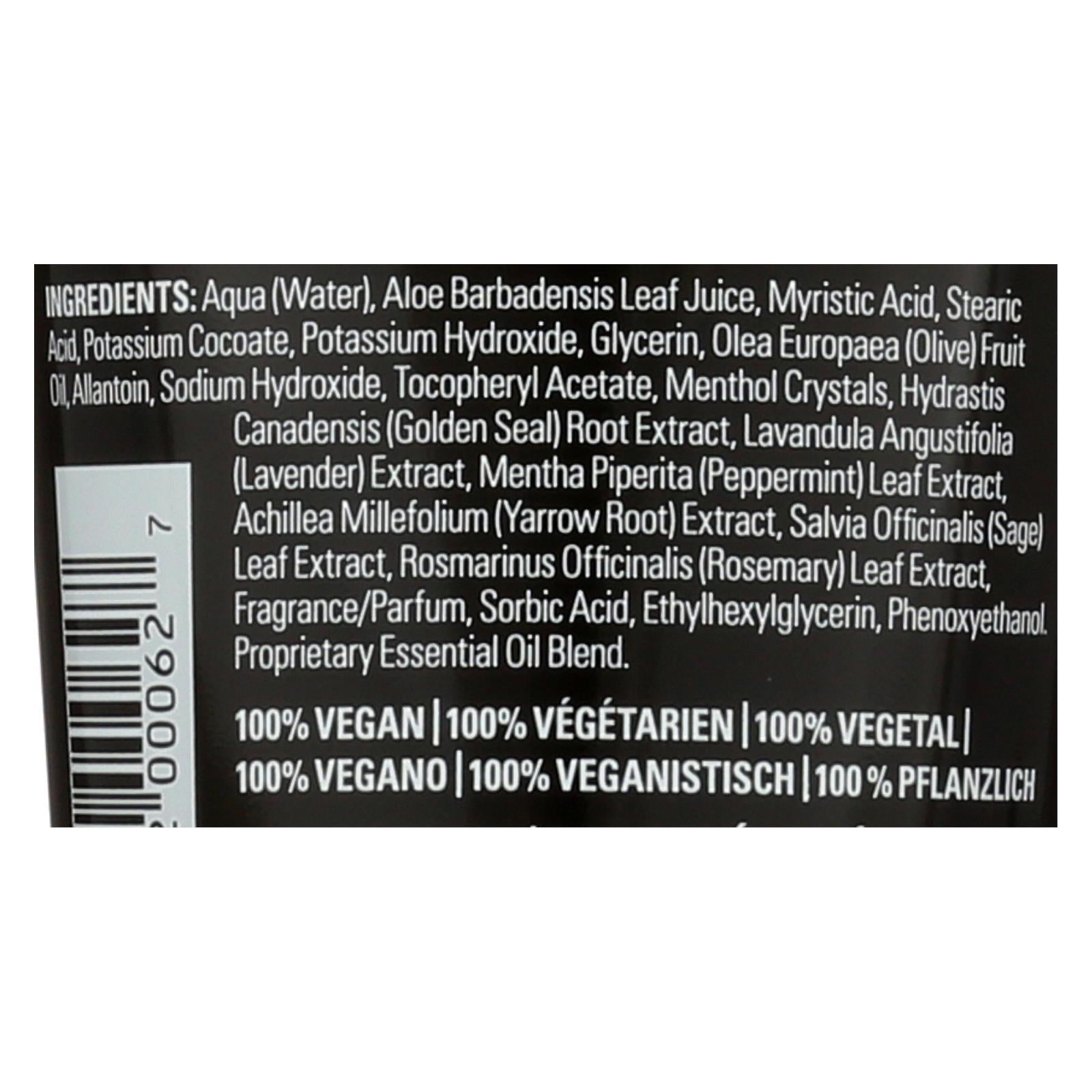 ingredients : water;aloe barbadensis leaf juice;myristic acid;stearic acid;potassium cocoate;potassium hydroxide;glycerin;olea europaea;olive;fruit oil;allantoin;sodium hydroxide;tocopheryl acetate;menthol crystals;hydrastis canadensis;golden seal;root extract;lavandula angustifolia;lavender;extract;mentha piperita;peppermint;leaf extract;achillea millefolium;yarrow root;salvia officinalis;sage;rosmarinus officinalis;rosemary;fragrance;sorbic acid;ethylhexylglycerin;phenoxyethanol. Proprietary essential oil b