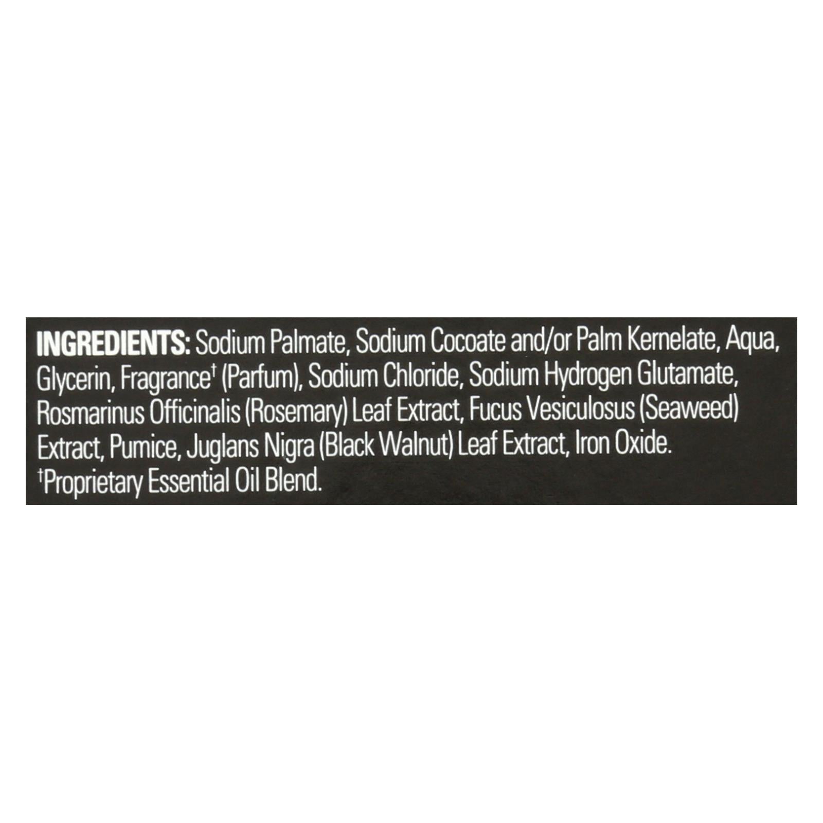 ingredients : sodium palmate;sodium cocoate and/or palm kernelate;aqua;glycerin;fragrance†;parfum;sodium chloride;sodium hydrogen glutamate;rosmarinus officinalis;rosemary;leaf extract;fucus vesiculosus;seaweed;extract;pumice;juglans nigra;black walnut;iron oxide