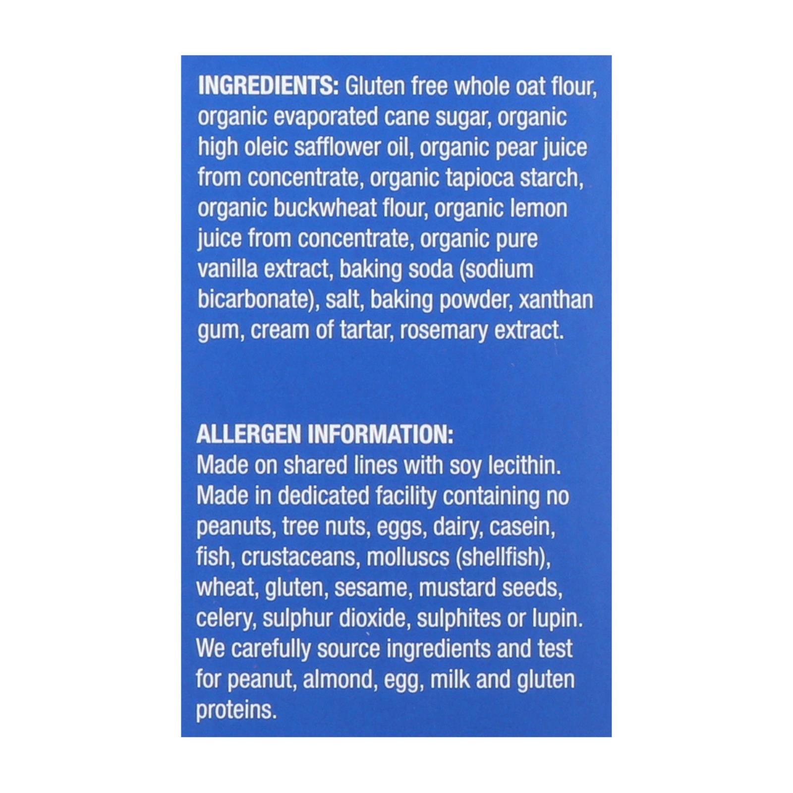 ingredients : gluten free whole oat flour;organic evaporated cane sugar;organic high oleic safflower oil;organic pear juice from concentrate;organic tapioca starch;organic buckwheat flour;organic lemon juice from concentrate;organic pure vanilla extract;baking soda;sodium bicarbonate;salt;baking powder;xanthan gum;cream of tartar;rosemary extract