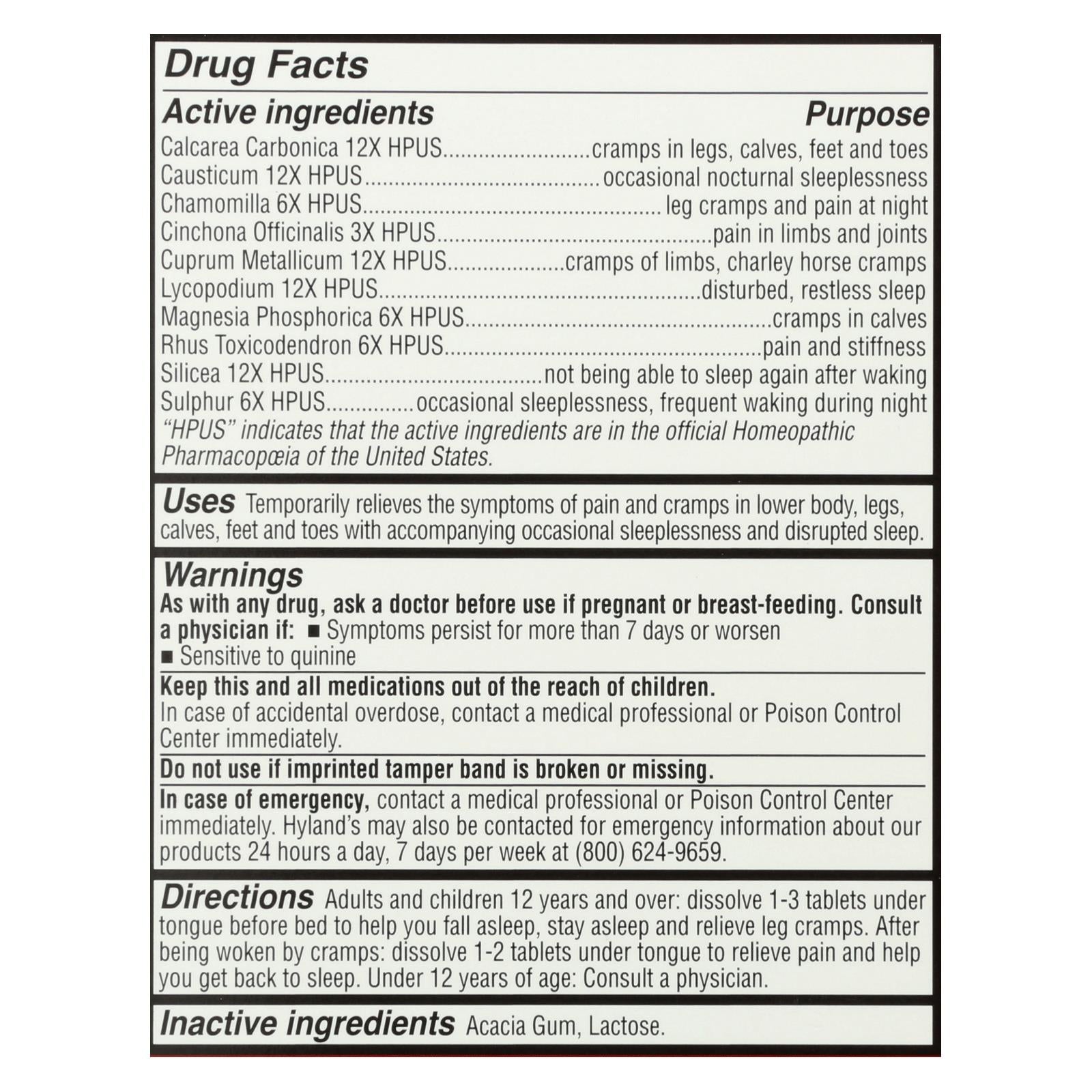 ingredients : acacia gum;lactose;calcarea carbonica 12x hpus purpose cramps in legs;calves;feet and toes causticum 12x hpus purpose occasional nocturnal sleeplessness chamomilla 6x hpus purpose leg cramps and pain at night cinchona officinalis 3x hpus purpose pain in limbs and joints cuprum metallicum 12x hpus purpose cramp limbs;charley horse cramps lycopodium 12x hpus purpose disturbed;restless sleep magnesia phosphorica 6x hpus purpose cramps in calves rhus toxicodendron 6x hpus purpose pain and stiffness