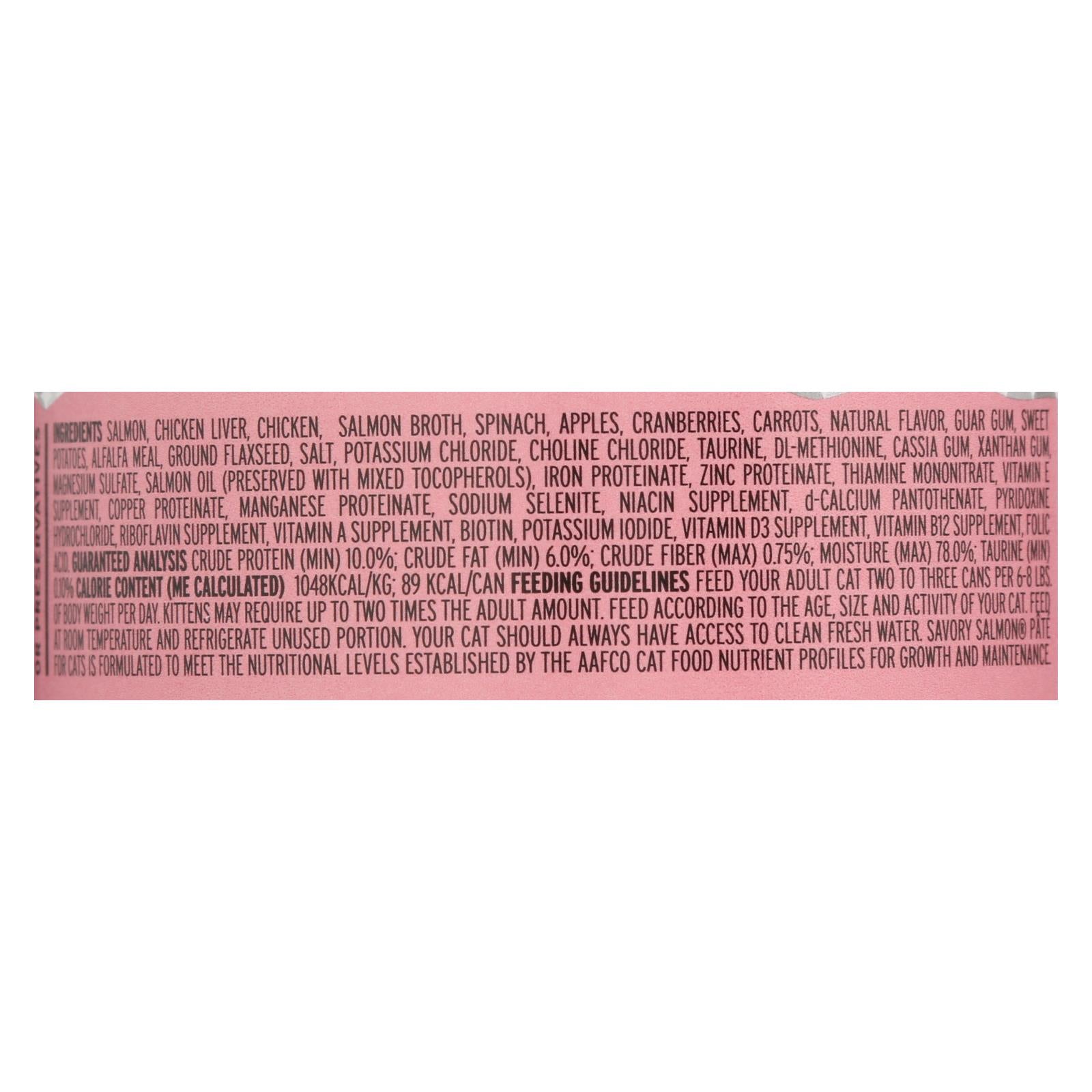 ingredients : salmon;chicken liver;chicken;salmon broth;spinach;apples;cranberries;carrots;natural flavor;guar gum;sweet potatoes;alfalfa meal;ground flaxseed;salt;potassium chloride;choline chloride;taurine;dl-methionine;cassia gum;xanthan gum;magnesium sulfate;salmon oil;preserved with mixed tocopherols;iron proteinate;zinc proteinate;thiamine mononitrate;vitamin e supplement;copper proteinate;manganese proteinate;sodium selenite;niacin supplement;d-calcium pantothenate;pyridoxine hydrochloride;riboflavin s