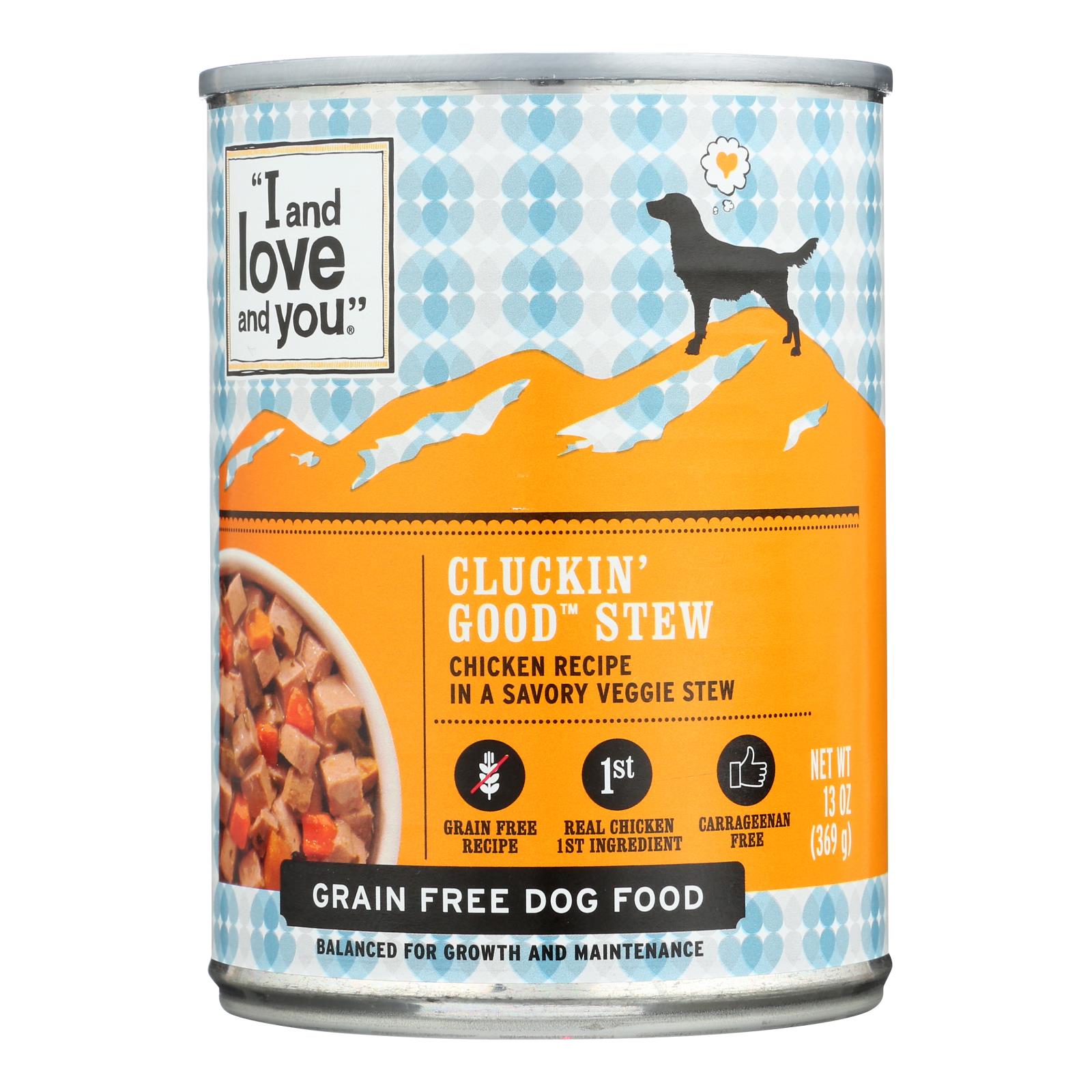 I and love and you dog canned food, cluckin' good stew is natural with added vitamins and minerals. This protein-rich dog food is made with real chicken morsels in a savory veggie stew. This grain and gluten-free dog food is also full of antioxidants and does not contain artificial colors, flavors or preservatives. Each can of i and love and you dog canned food, cluckin' good stew contains 13 oz. Of product.