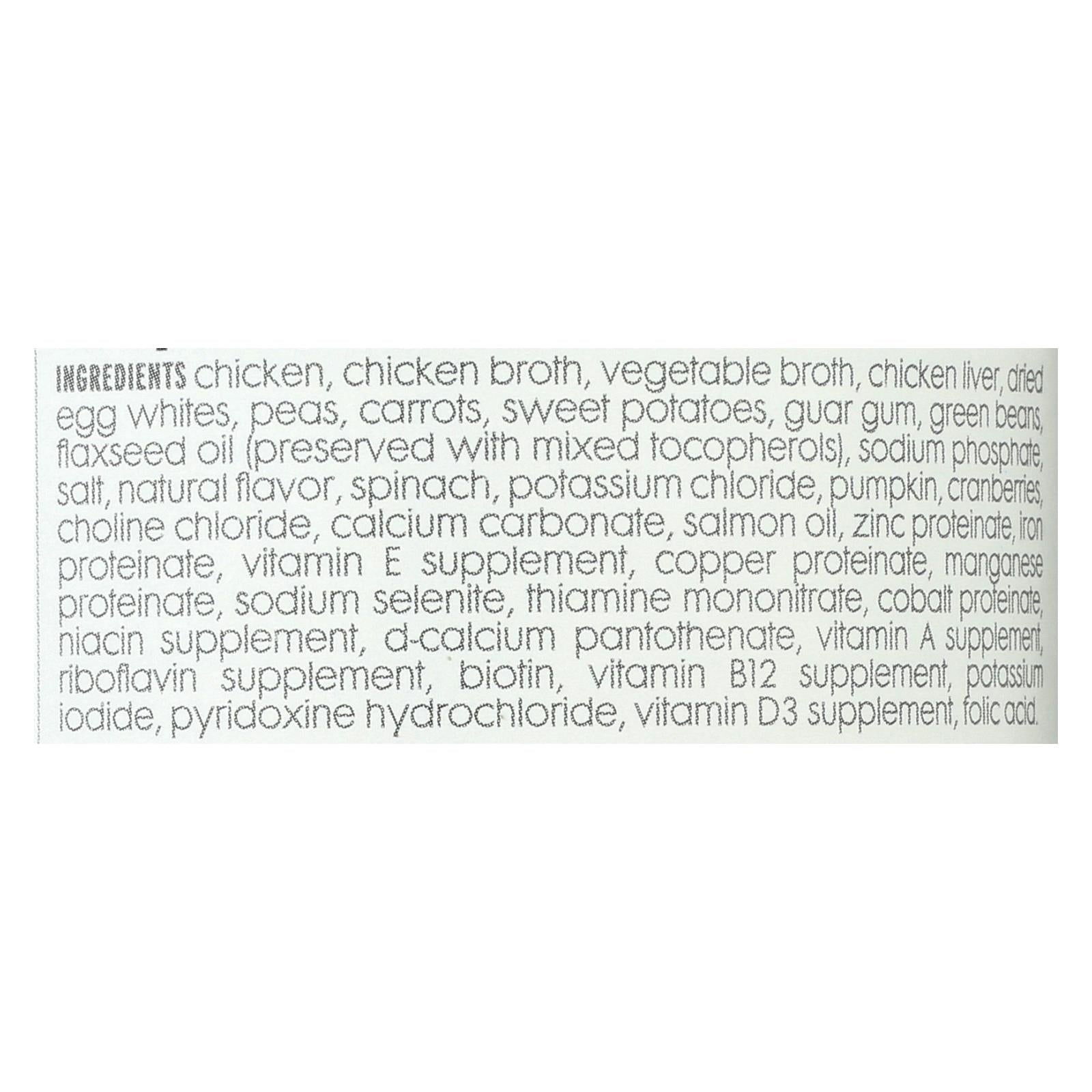 ingredients : chicken;chicken broth;vegetable broth;chicken liver;dried egg white;carrots;cranberries;dried peas;spinach;sweet potatoes;green beans;guar gum;flaxseed oil;preserved with mixed tocopherols;sodium phosphate;salt;natural flavor;potassium chloride;pumpkin;choline chloride;salmon oil;zinc proteinate;tricalcium phosphate;iron proteinate;vitamin e supplement;copper proteinate;manganese proteinate;sodium selenite;thiamine mononitrate;cobalt proteinate;niacin supplement;d-calcium pantothenate;vitamin a