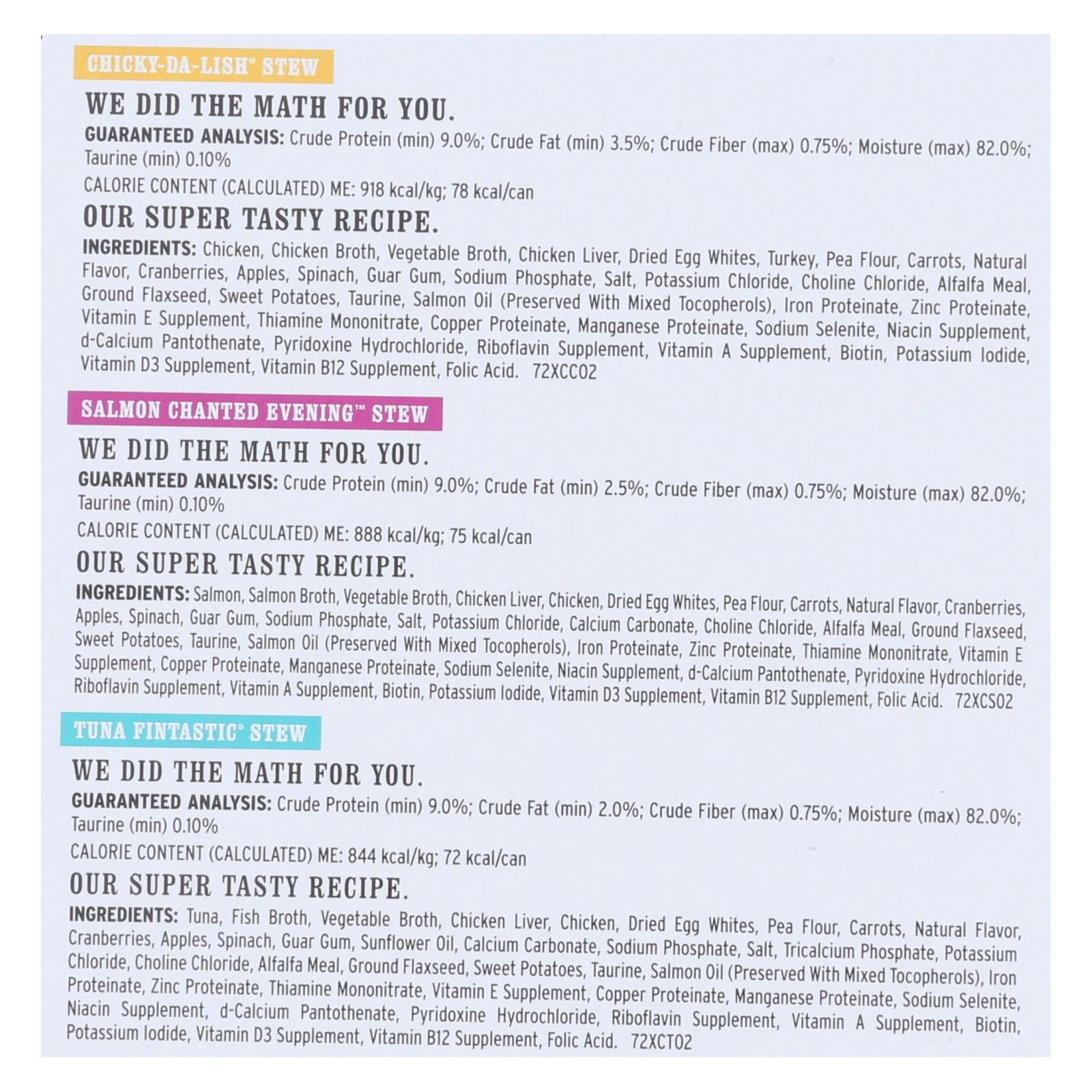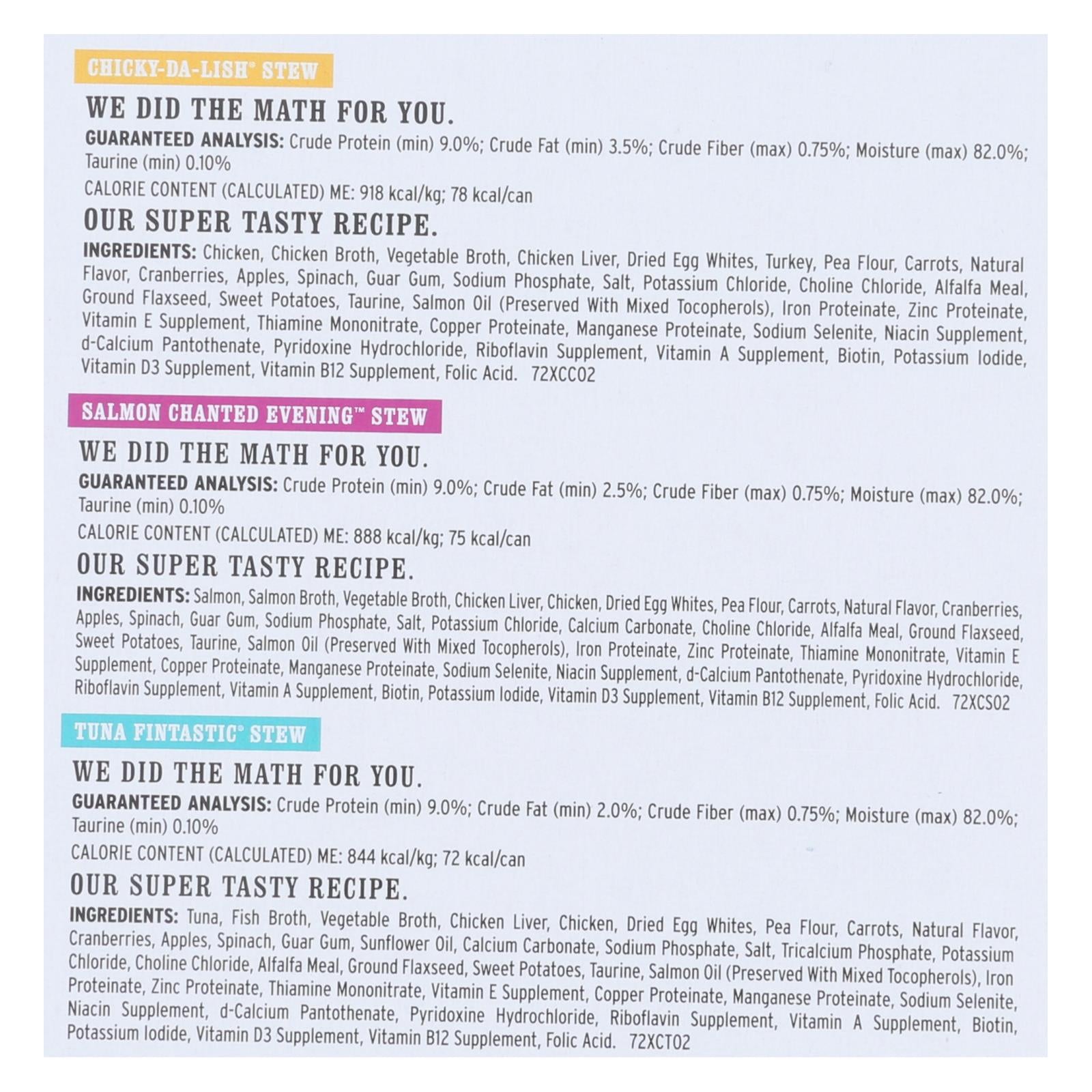 ingredients : chicky-da-lish* stew: chicken;chicken broth;vegetable broth;chicken liver;dried egg whites;turkey;pea flour;carrots;natural flavor;cranberries;apples;spinach;guar gum;sodium phosphate;salt;potassium chloride;choline chloride;alfalfa meal;ground flaxseed;sweet potatoes;taurine;salmon oil;preserved with mixed tocopherols;iron proteinate;zinc proteinate;vitamin e supplement;thiamine mononitrate;copper proteinate;manganese proteinate;sodium selenite;niacin supplement;d-calcium pantothenate;pyridoxin