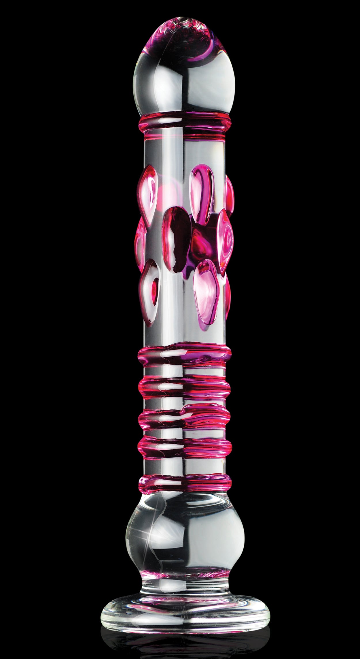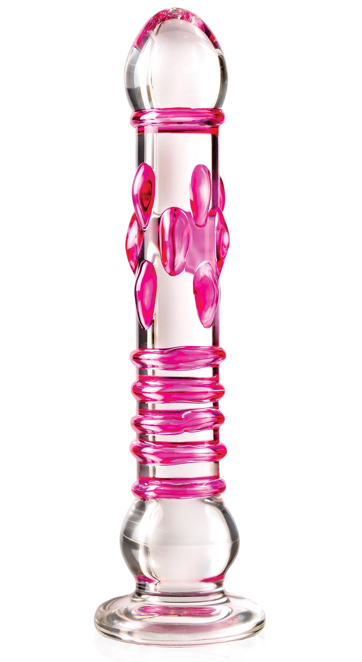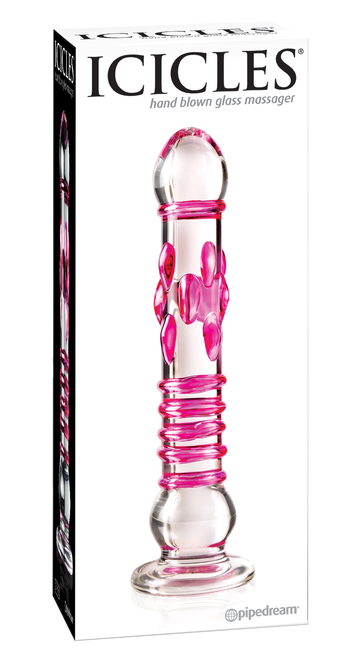 Icicles No. 6 is a non-vibrating glass massager. Elegant, upscale, and hand crafted with amazing attention to detail, this luxurious line of glass massagers will leave you breathless. This wand is perhaps the most complex of the series. Clear glass wand with a rounded head, followed by a single ring at the neck then pleasure nubs in the upper half and 4 perfect sized rings for internal and clitoral stimulation. Near the base is a single faux testicle final item of interest is the flat base. Each hand-blown Icicle glass wand is sleek, unique, and made to play hard. The hypoallergenic glass is nonporous and body safe, and when cared for properly, is designed to last a lifetime. Run the wand under warm water or place it in the microwave to heat things up. Please use care when heating wand in the microwave start with 10 seconds burst. Test on wrist before using as a sex toy. Chill it under cold water or put it in the freezer for a cool sensation. Since glass is nonporous, cleanup is a snap. Use Pipedream Toy Cleaner and warm water, or throw it in the dishwasher for a worry-free wash after the fun. Glass massager measures 8.5 inches long by 1.75 inches wide with a girth of 4.5 inches around. Made using phthalate free, non-toxic materials glass.