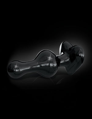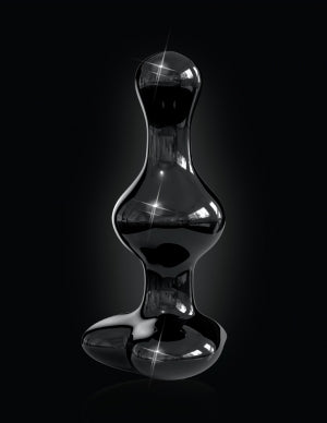 Icicles No. 74 PD287400. Elegant, upscale, and hand crafted with amazing attention to detail, this luxurious line of glass massagers will leave you breathless. Each hand blown Icicle glass wand is sleek, unique, and made to play hard. The hypoallergenic glass is nonporous and body safe, and when cared for properly, is designed to last a lifetime. Run the wand under warm water or place it in the microwave to heat things up. Chill it under cold water or put it in the freezer for a cool sensation. Since glass is nonporous, cleanup is a snap. Use Pipedream Toy Cleaner and warm water, or put it in the dishwasher for a worry free wash after the fun. Amazing for temperature play, sleek and super smooth, unique and hand crafted, non-porous, body safe and hypoallergenic. Black glass plug features a smooth small tapered head, followed by a slender neck, and bubble followed by another slender neck the end is shaped like a heart to prevent toy getting lost up there. Plus helps with easy use and retrieval. Insertable length 2.5 inches, width 1.3 inches.