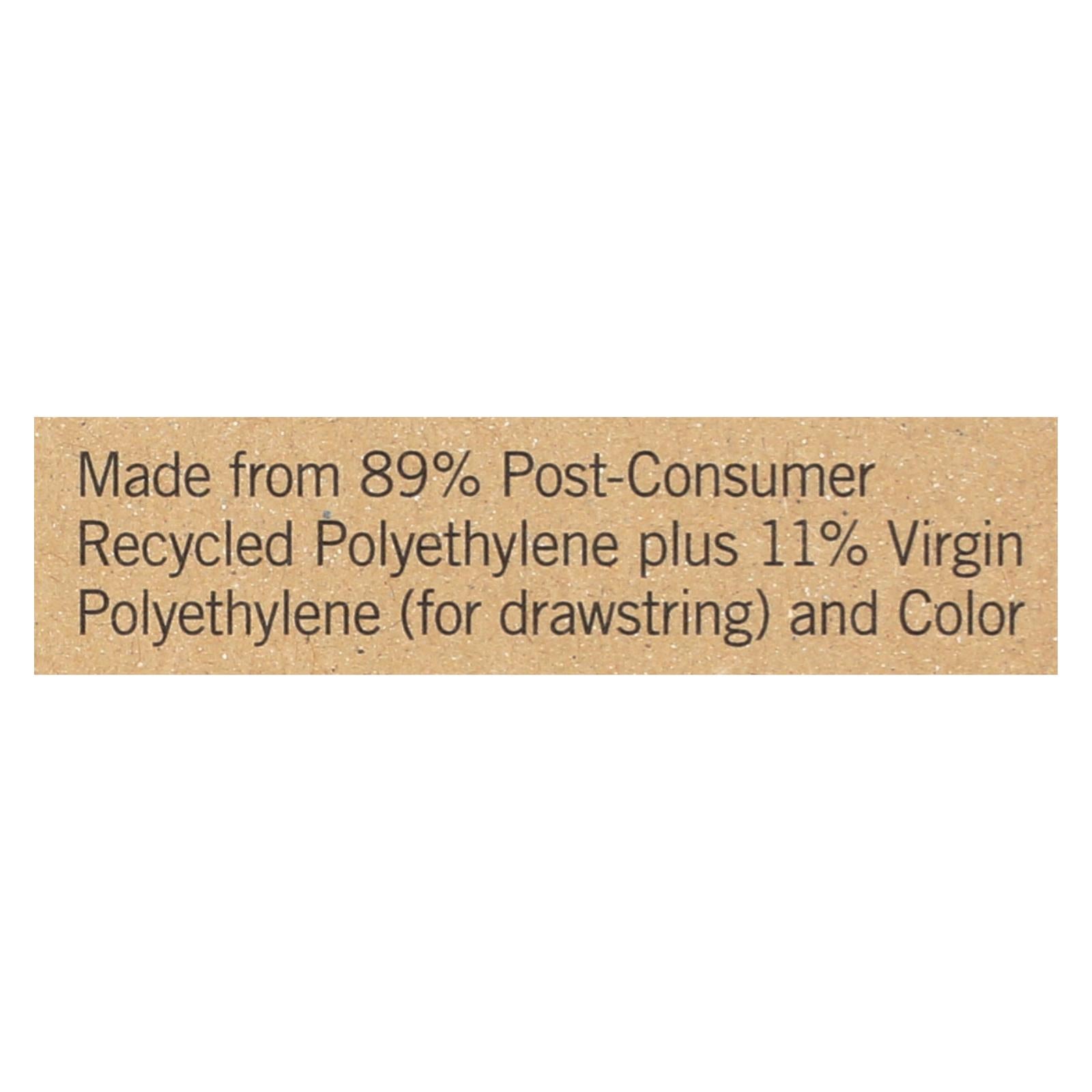 If you care tall kitchen drawstring trash bags are scs certified recycled content, made with 89% post-consumer recycled polyethylene. These extra strong bags are perfect for even the heaviest garbage, and perform equal to, if not better than, regular virgin plastic trash bags. Each box contains twelve 13-gallon bags to fit in all tall kitchen pails and include an easy drawstring for your convenience.