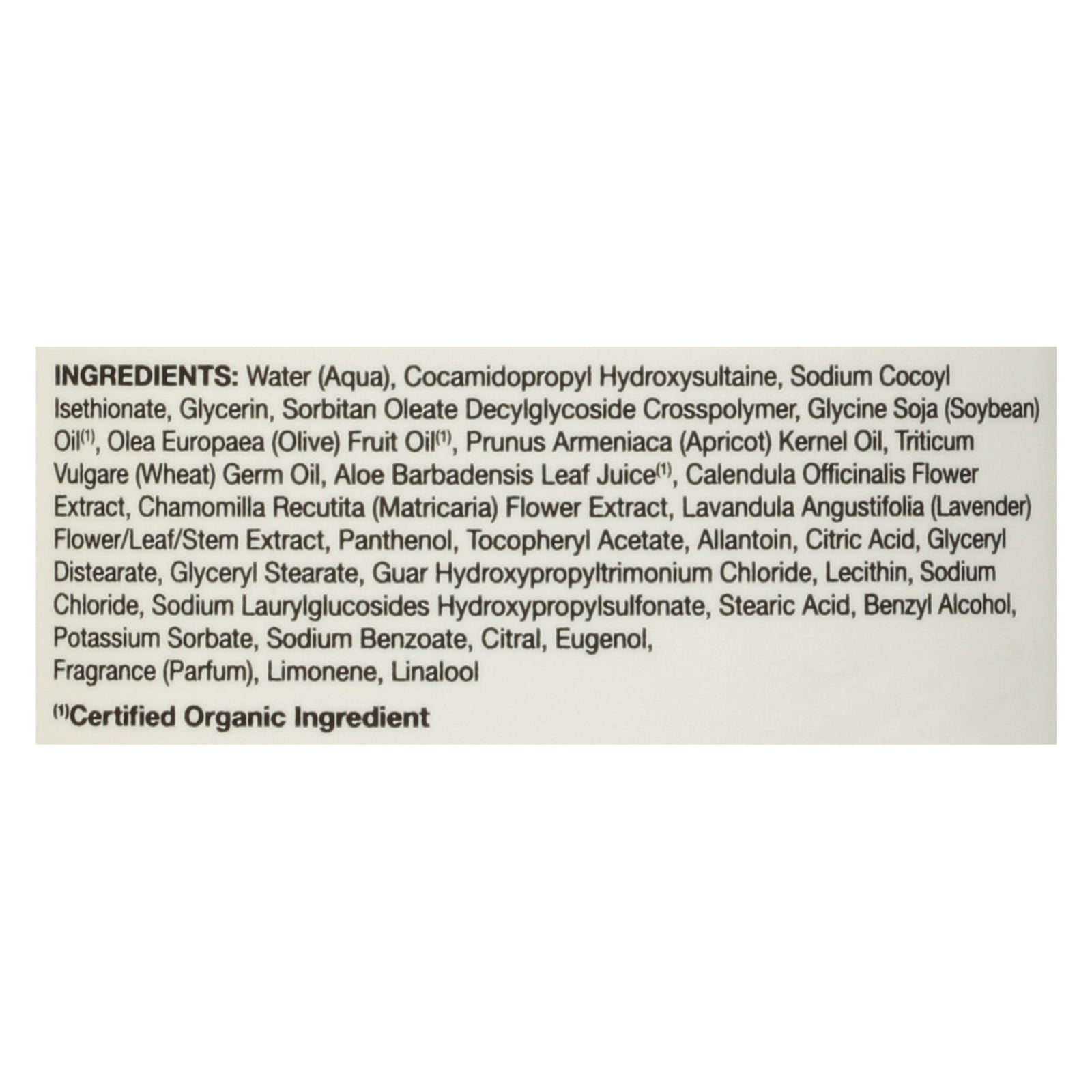 ingredients : water (aqua);cocamidopropyl hydroxysultaine;sodium cocoyl isethionate;glycerin;sorbitan oleate decylglycoside crosspolymer;glycine soja (soybean) oil ;olea europaea (olive) fruit oil ;prunus armeniaca (apricot) kernel oil;triticum vulgare (wheat) germ oil;aloe barbadensis leaf juice ;calendula officinalis flower extract;chamomilla recutita (matricaria) flower extract;lavandula angustifolia (lavender) flower/leaf/stem extract;panthenol;tocopheryl acetate;allantoin;citric acid;glyceryl diste
