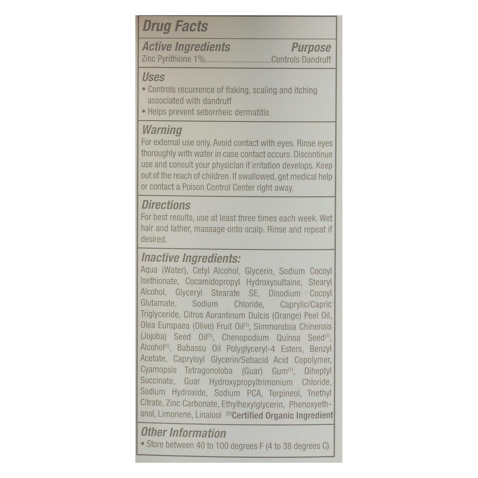 ingredients : drug facts active ingredient zinc pyrithione 1% purpose controls dandruff;inactive aqua;water;cetyl alcohol;glycerin;sodium cocoyl isethionate;cocamidopropyl hydroxysultaine;stearyl alcohol;glyceryl stearate se;disodium cocoyl glutamate;sodium chloride;caprylic/capric triglyceride;citrus aurantinum dulcis;orange;peel oil;olea europaea;olive;fruit oil ¹;simmondsia chinensis;jojoba;seed oil ¹;chenopodium ouinoa seer;alcohol ¹;babassu oil polyglyceryl-4 esters;benzyl acetate;capryloyl glycerin/seba
