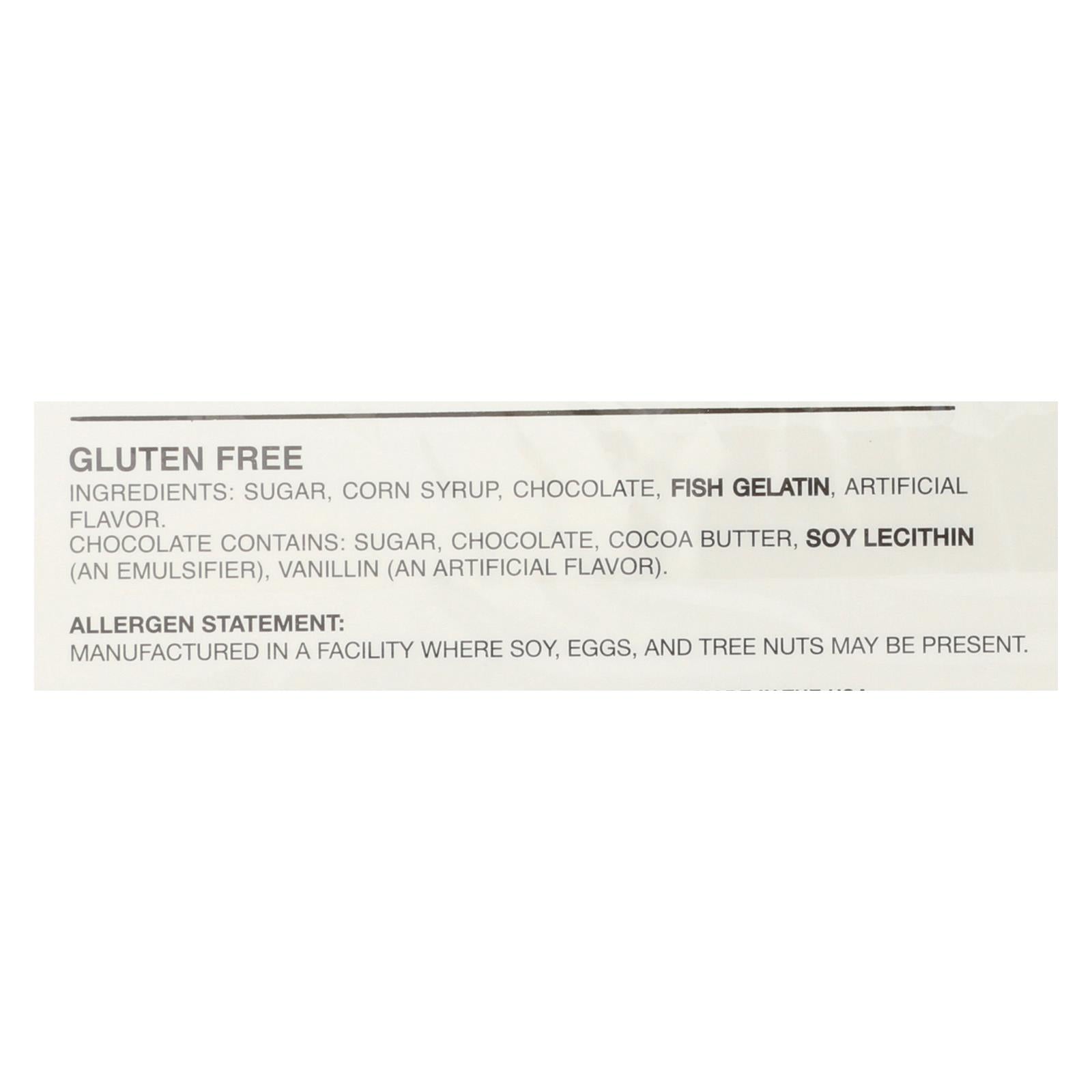 ingredients : sugar;corn syrup;chocolate;fish gelatin;artifical flavor. Chocolate contains: sugar;cocoa butter;soy lecithin;an emulsifier;vanillin;an artifical flavor