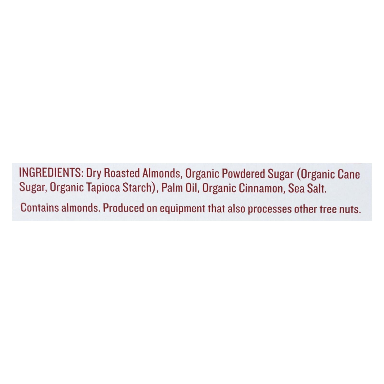ingredients : dry roasted almonds;organic powdered sugar;organic cane sugar;organic tapioca starch;palm oil;organic cinnamon;sea salt