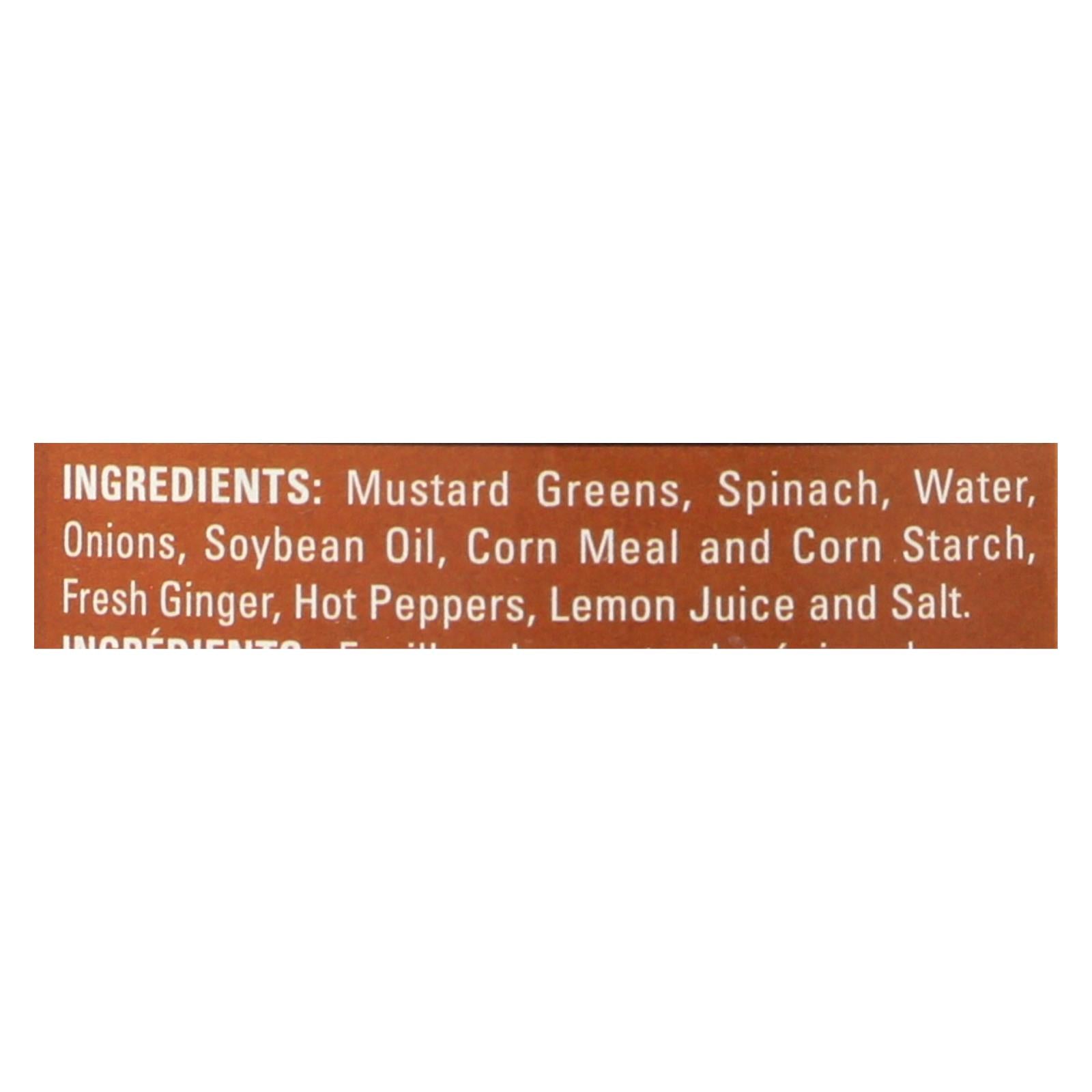 Spinach & mustard greens with ginger and peppers. All natural. Low fat. Wheat & gluten free. Heat 'n serve. Jyoti is from delhi, her delhi saag is a greens dish, served as a side dish. The natural taste of spinach and mustard greens is enhanced with ginger, hot peppers and lemon juice. No spices are used. Delhi saag is an excellent cooking sauce for chicken, lamb, vegetables, and a soup base. Create indian home style culinary delights like a pro! what's so special? home style cooking, in small batches with fresh, natural ingredients using nutritional recipes that deliver authentic tastes and aromas. No preservatives, nothing artificial! jyoti prepares a range of delicious indian foods for today's life styles. If it doesn't taste home cooked, it's not jyoti! vegetarian. Product of usa.